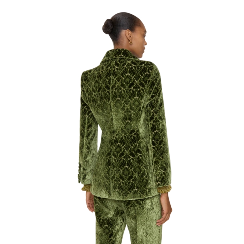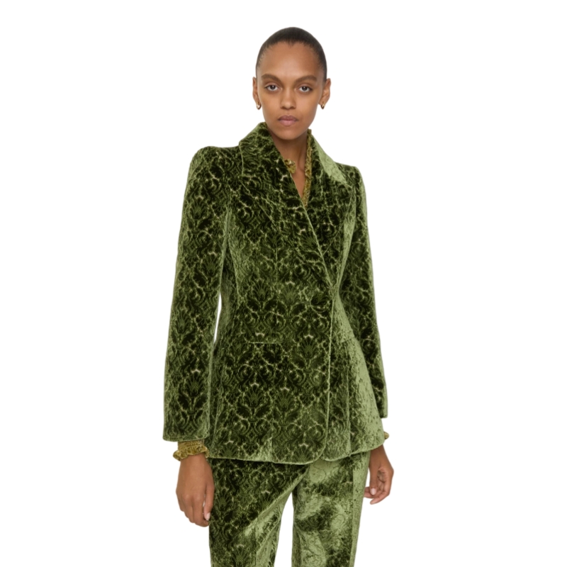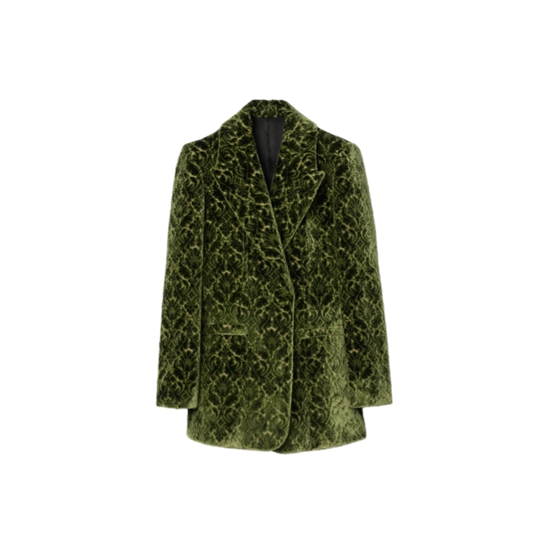 A blazer made in Italy from jacquard-woven velvet damask, debuted on the Burberry Winter 2025 runway. The intricate raised fabric evokes the rococo-style flocked wallpapers found in British stately homes. Tailored to a slim fit and lined with satin.