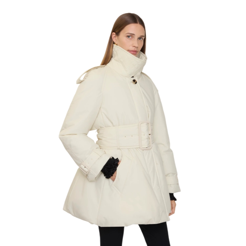 Reimagining our signature rainwear, the Berryhill car coat is cut to a shorter length and padded with goose down and feathers. Shaped with wide sleeves and a fuller skirt, the relaxed silhouette features an oversized belt to emphasise the waist. The undercollar is embroidered with a tonal check pattern and the curlicue shape of the pockets is inspired by an archival trench.
