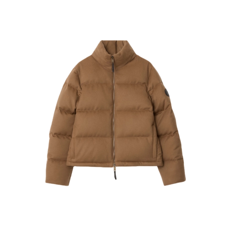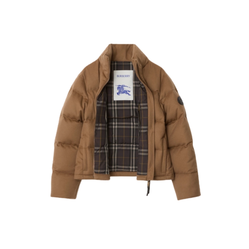 A funnel-neck puffer jacket elevated in cashmere, brushed for a soft finish and filled with goose down and feathers. Cut to a regular fit, the Ambleside features a drawcord hem to adjust the shape and a Burberry Check packaway hood for unpredictable weather. The design is finished with a leather Knight stamp, an archival motif first used in the 1980s.