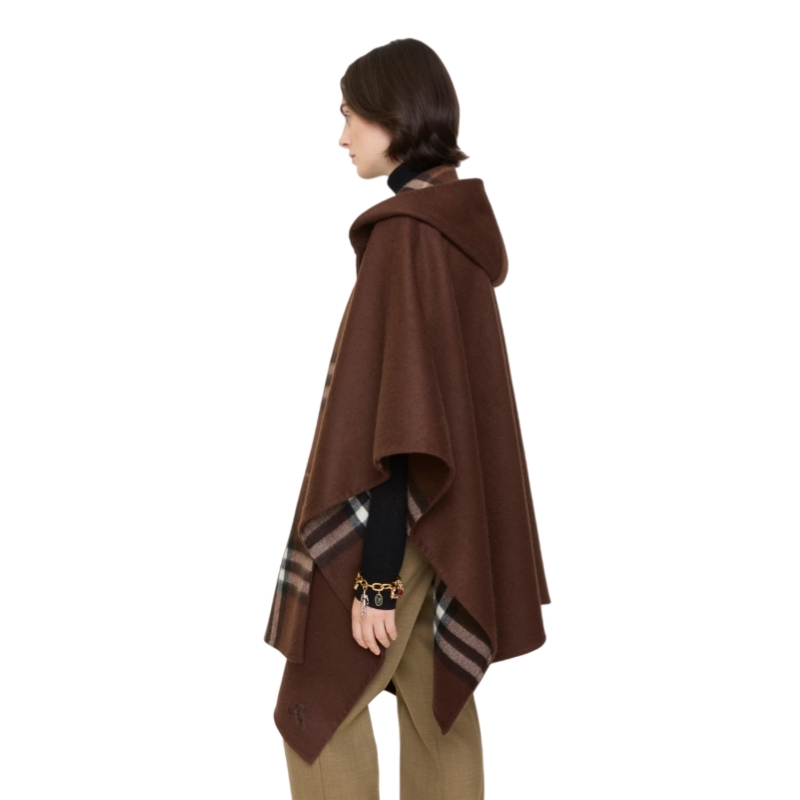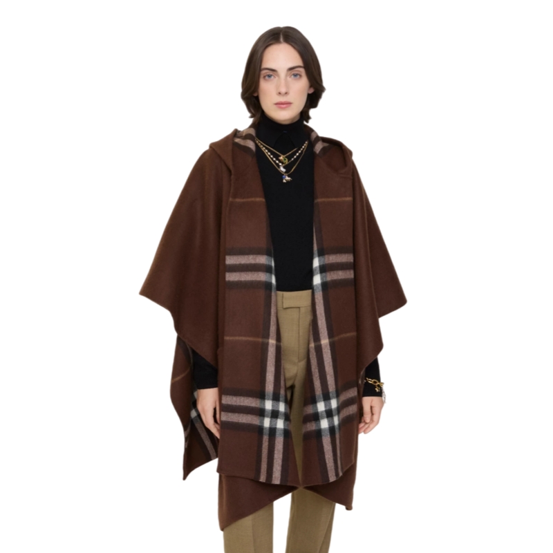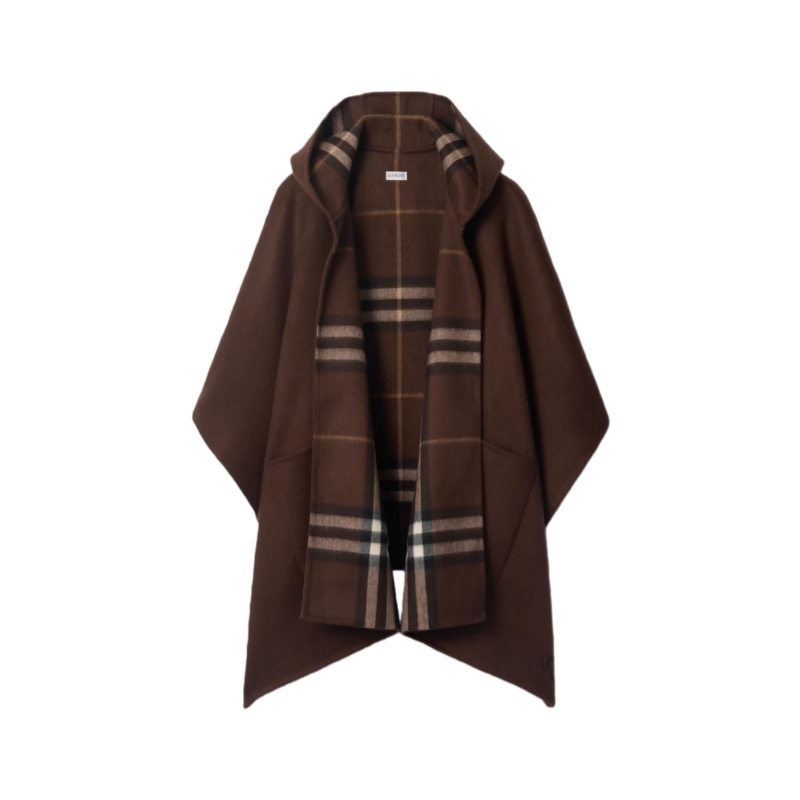 A hooded cape in cashmere, embroidered with a tonal Equestrian Knight Design. Made at a Scottish mill founded in 1797, the fabric is washed in local spring water and brushed for a soft finish. The inner is woven with Burberry Check.