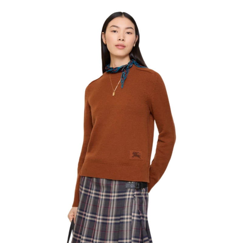 A sweater made from ultra-soft cashmere with a hint of stretch, cut to a regular fit. The crew-neck style is knitted with tonal elbow patches, chain-stitching at the shoulders and a contrasting Equestrian Knight Design.