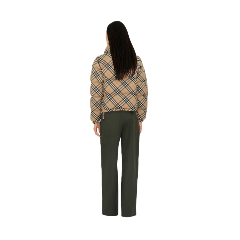 A puffer jacket in Burberry Check, cut to a regular fit with B-cut zip pulls. The Ambleside features a packaway hood and a Knight stamp appliqué, an archival motif from the 1980s.