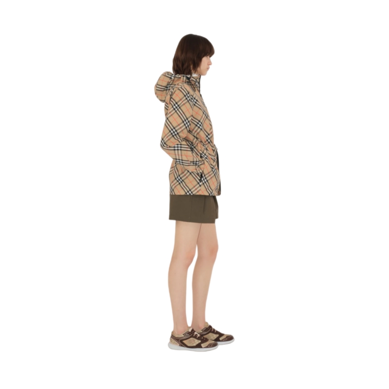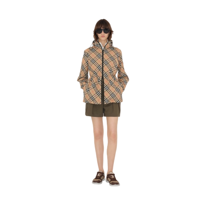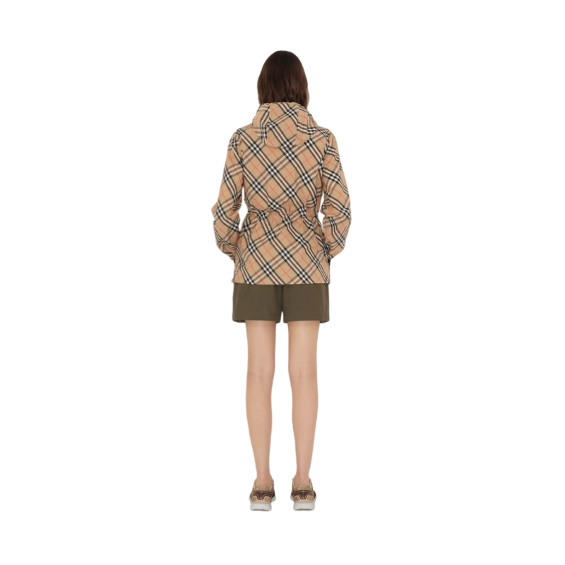 A hooded jacket woven with the Burberry Check, cut to a relaxed fit with a drawcord to adjust the waist. The lightweight style is appliquéd with our Knight stamp at the sleeve – an archival motif first seen on Burberry bags in the 1980s.