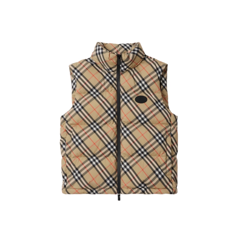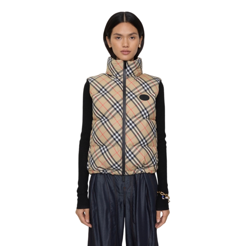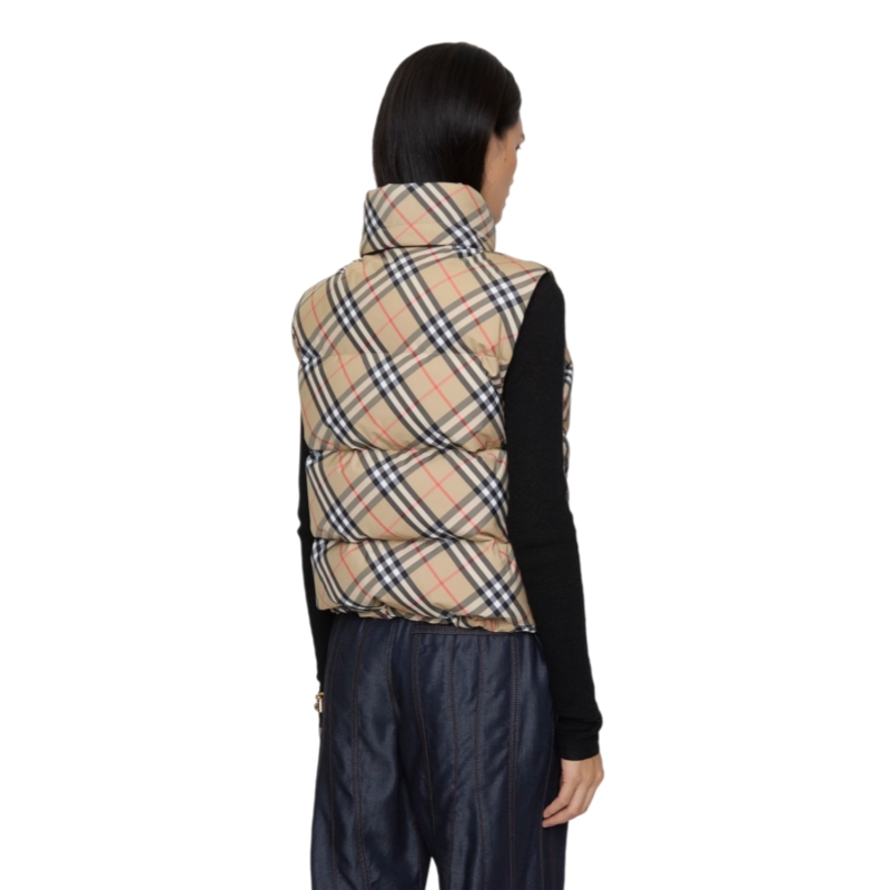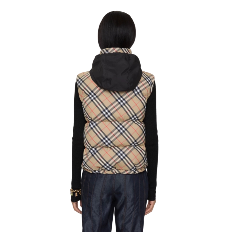 A puffer gilet in water-repellent Burberry Check, cut to a regular fit and filled with goose down and feathers. The design features a packaway hood for unpredictable weather and is finished with our Knight stamp, an archival motif first used in the 1980s.