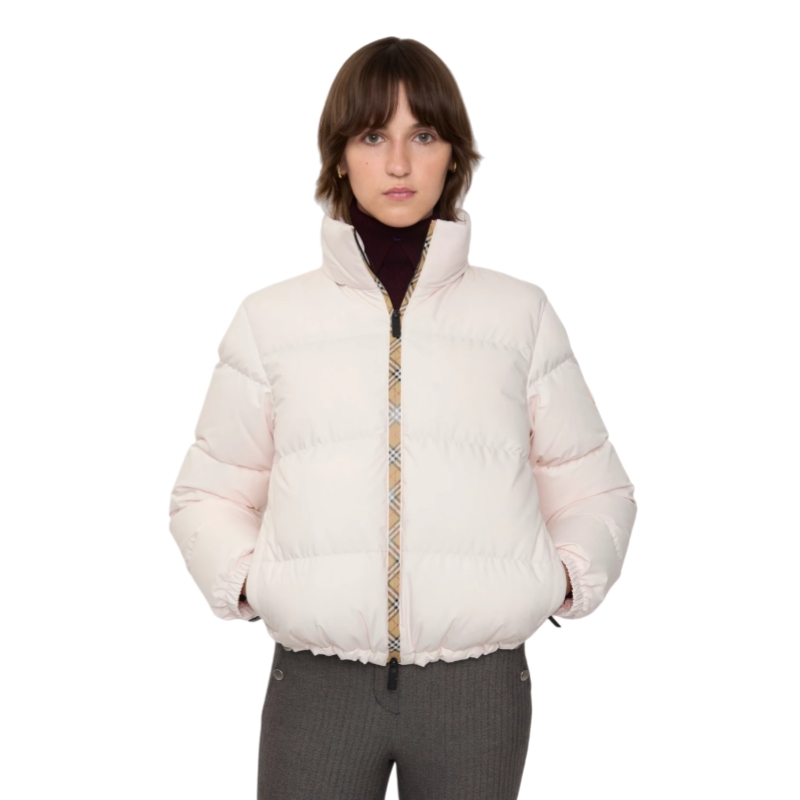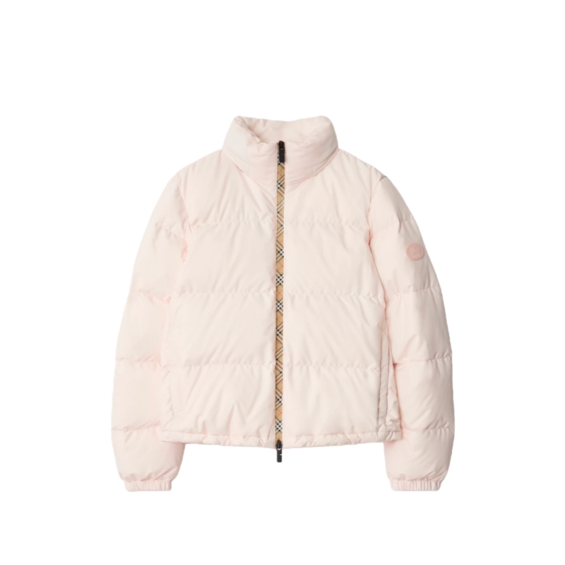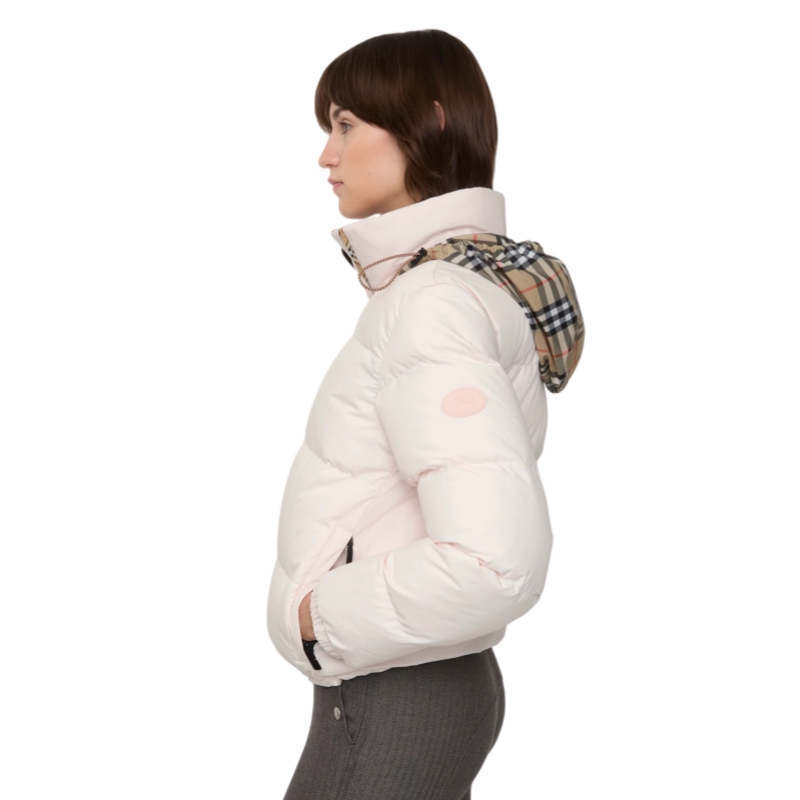 A puffer jacket with Burberry Check taping at the front zip and a packaway hood in our signature sand beige colourway. The Ambleside is cut to a regular fit and appliquéd with our Knight stamp, an archival motif from the 1980s.