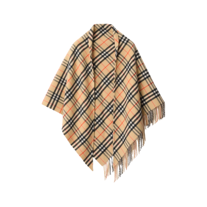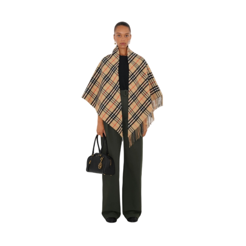 A cape in wool cashmere woven with the Burberry Check. Made at a Scottish mill founded in 1797, the fabric is washed in local spring water and receives two further washes for an ultra-soft finish and raised nap.