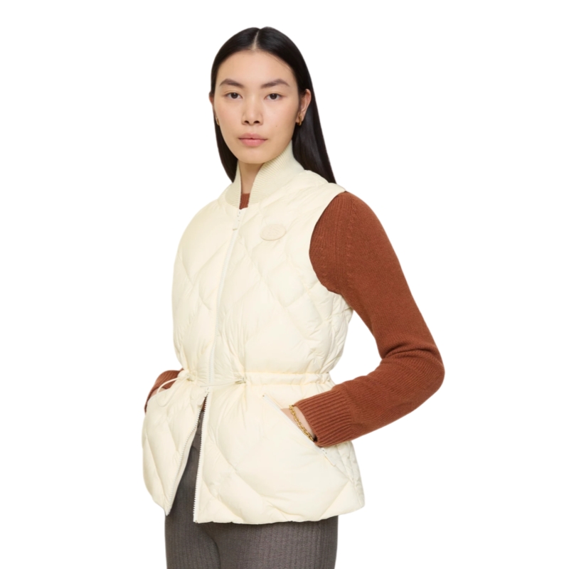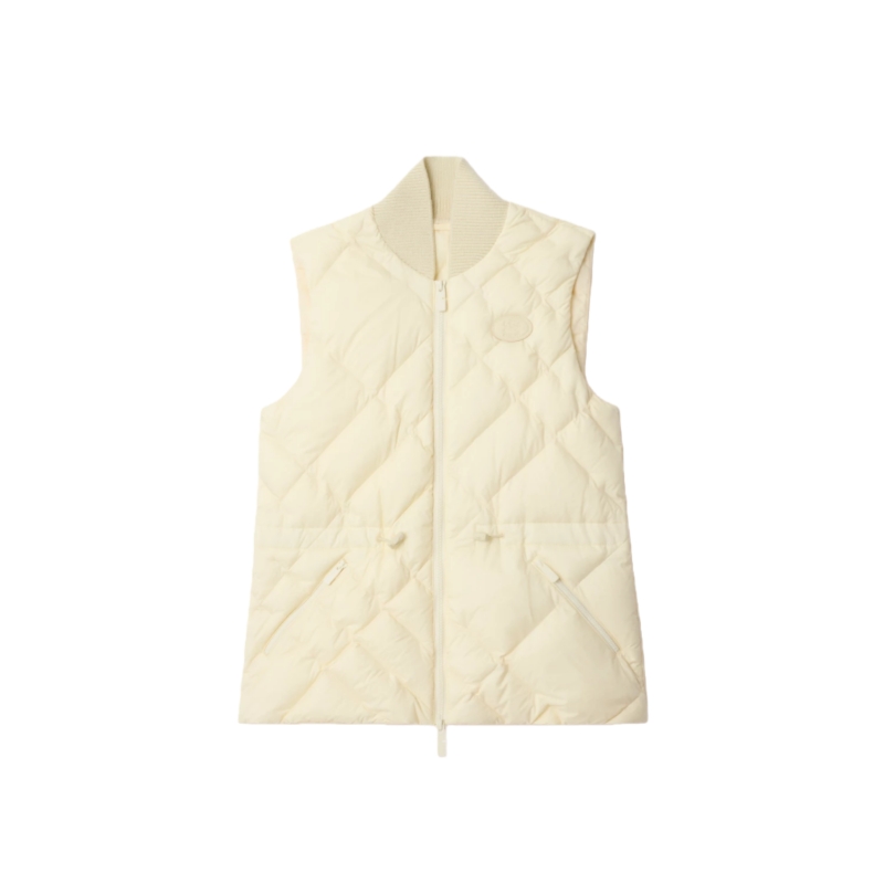 A gilet in lightweight water-resistant nylon detailed with our check-stitch – a new take on quilted stitching inspired by the iconic house code. The style is knitted with a tonal wool-blend collar and finished with an appliquéd leather Knight stamp, an archival motif first seen on Burberry bags in the 1980s. Cut to a regular fit that cinches at the waist and filled with goose down and feathers for warmth.