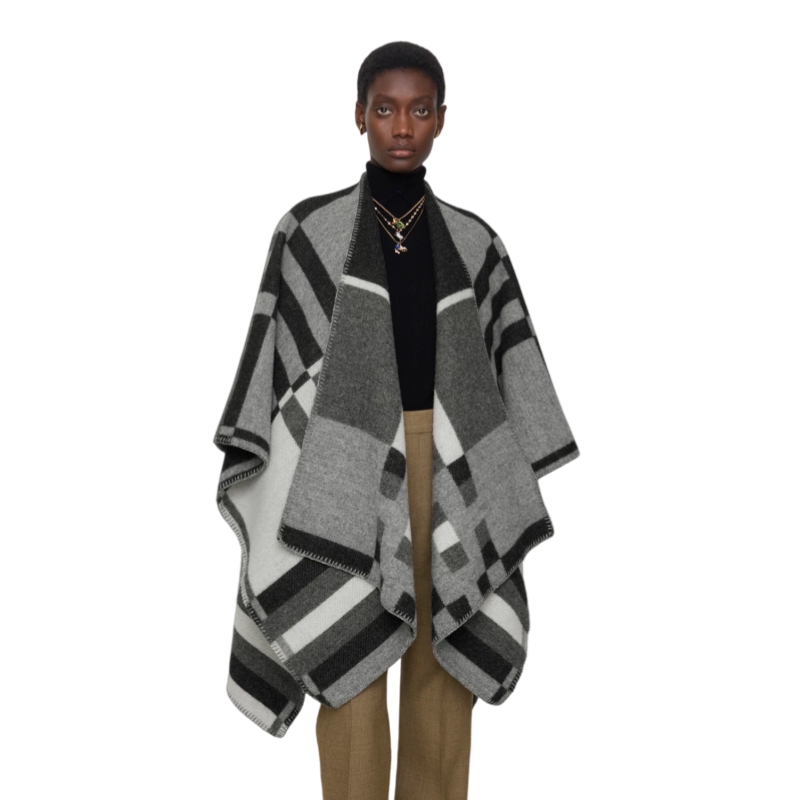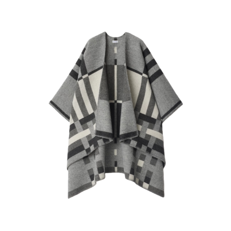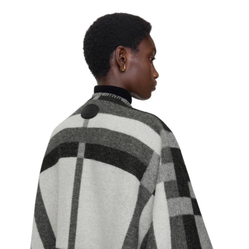A wool cape made at a Scottish mill founded in 1797, jacquard-woven with the Burberry Check in a colour-block design. The yarn originates from sheep native to the Shetland Islands, celebrated for their fine, soft fleece. The style is edged with blanket stitching and features a leather Knight stamp appliqué – an archival motif first seen on Burberry bags in the 1980s. Comes with a horse-shaped pin inspired by our Equestrian Knight Design.