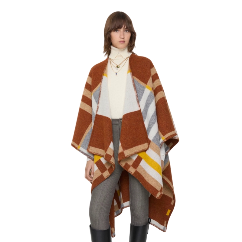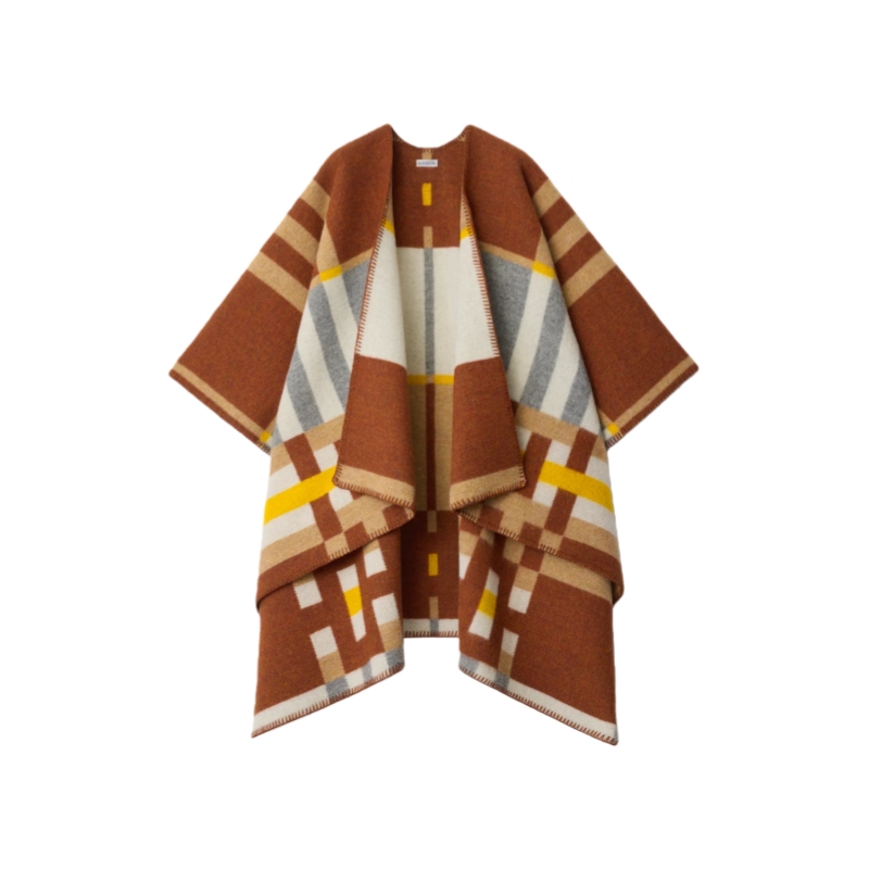A wool cape made at a Scottish mill founded in 1797, jacquard-woven with the Burberry Check in a colour-block design. The yarn originates from sheep native to the Shetland Islands, celebrated for their fine, soft fleece. The style is edged with blanket stitching and features a leather Knight stamp appliqué – an archival motif first seen on Burberry bags in the 1980s. Comes with a horse-shaped pin inspired by our Equestrian Knight Design.