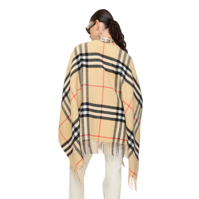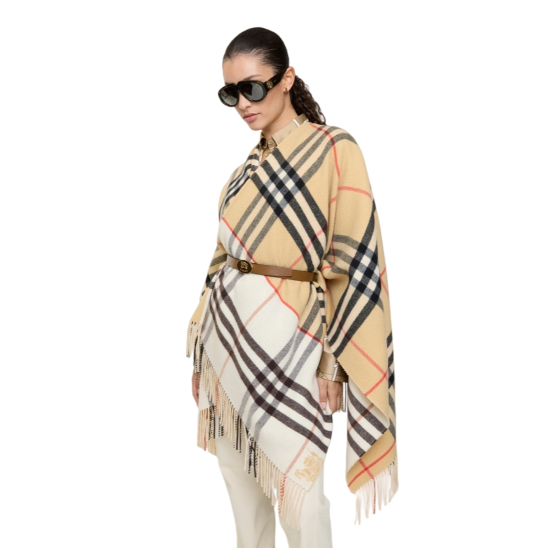 A cape in double-faced cashmere wool woven with the Burberry Check in contrasting colours. Made at a Scottish mill founded in 1797, the fabric is washed in local spring water and receives two further washes for an ultra-soft finish. The fringed style is finished with a tonal Equestrian Knight Design.