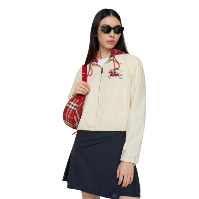 The classic Harrington jacket is reworked in a lightweight stretch nylon twill, with a detachable Burberry Check hood for unpredictable British weather. The cropped silhouette is cut to a relaxed fit with raglan sleeves for a softly curved shoulder. Our Equestrian Knight Design is embroidered at the chest in textured and metallic threads – created as part of our Year of the Horse capsule.