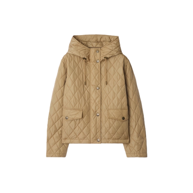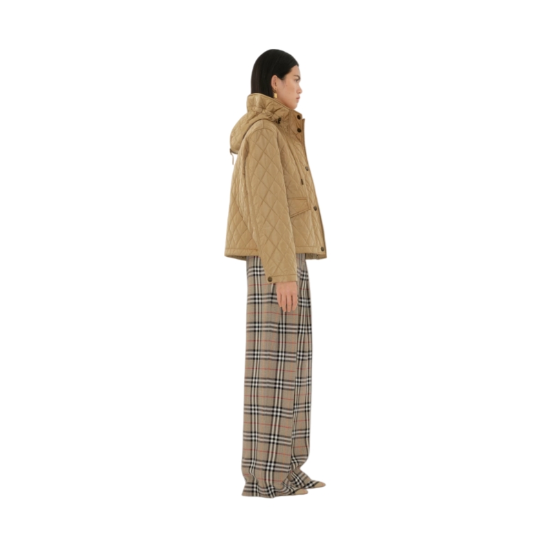 A quilted jacket made from lightweight nylon, cut to a regular fit with a drawcord hood. The cropped style is lined with Burberry Check cotton twill in our signature sand colourway.