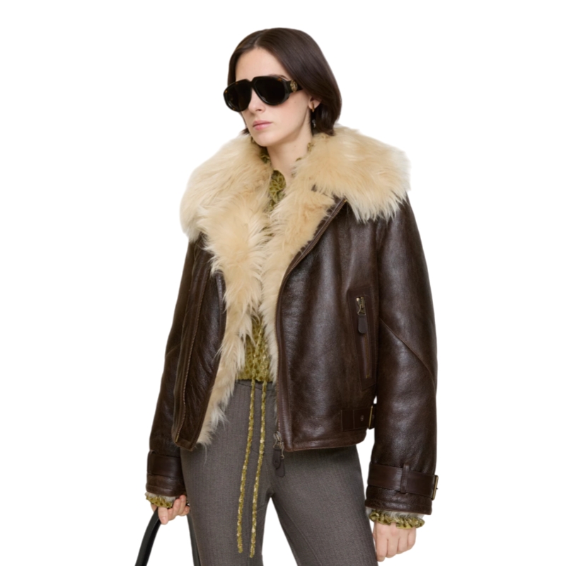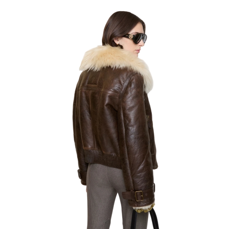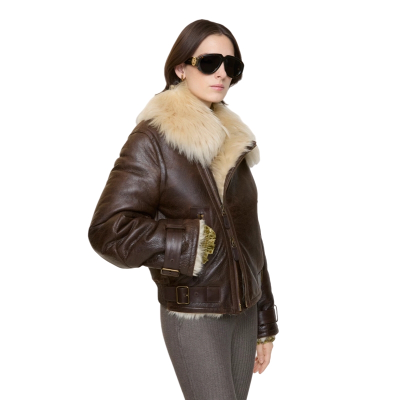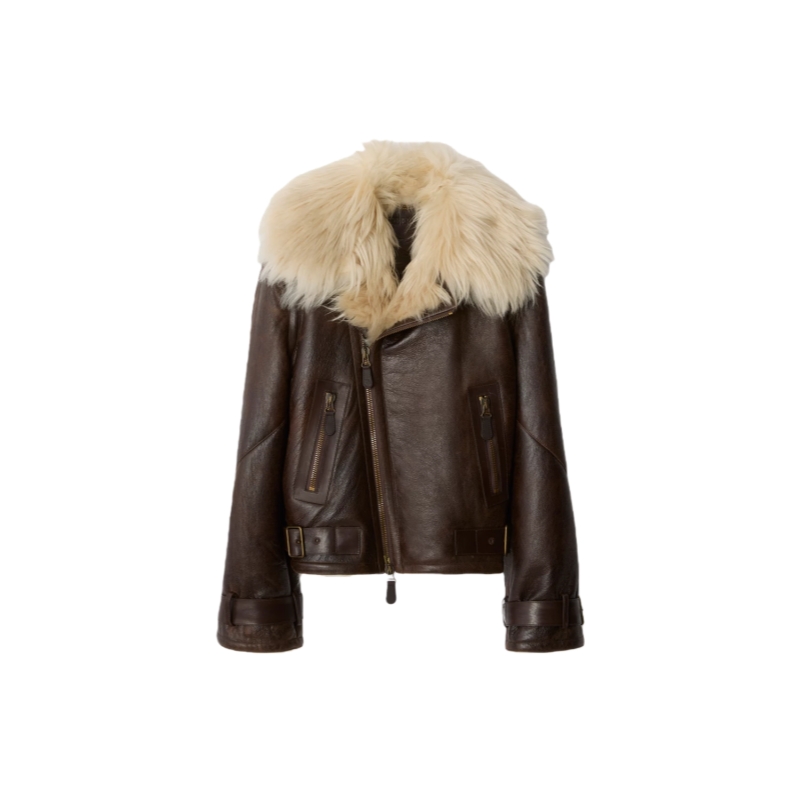 Reinterpreting Burberry's outerwear heritage, an aviator jacket made in Italy from long-haired shearling with contrasting calf leather taping. The double-breasted design – debuted on the Burberry Winter 2025 runway – is cut to a cropped, regular fit and features B buckle side adjusters with an antique finish.