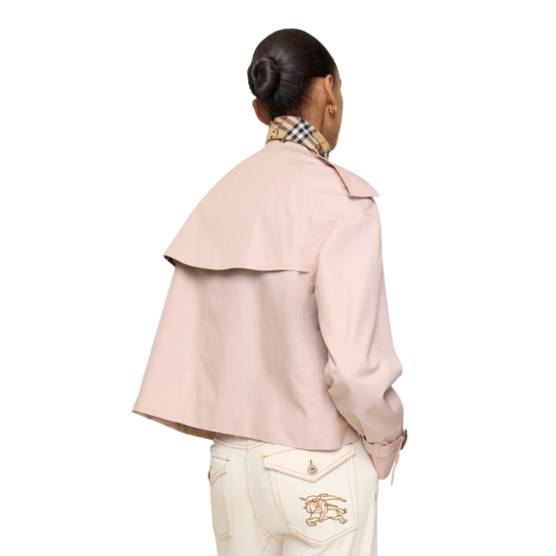 A cropped jacket inspired by our iconic trench, made from water-resistant tropical gabardine with a seasonal sugar pink hue. The lightest of our signature fabrics, tropical gabardine was developed by our founder Thomas Burberry for warmer climates. Inside is Burberry Check cotton in archive beige, used to line our coats since the 1920s. Crafted in Castleford, Yorkshire and tailored to a relaxed fit.