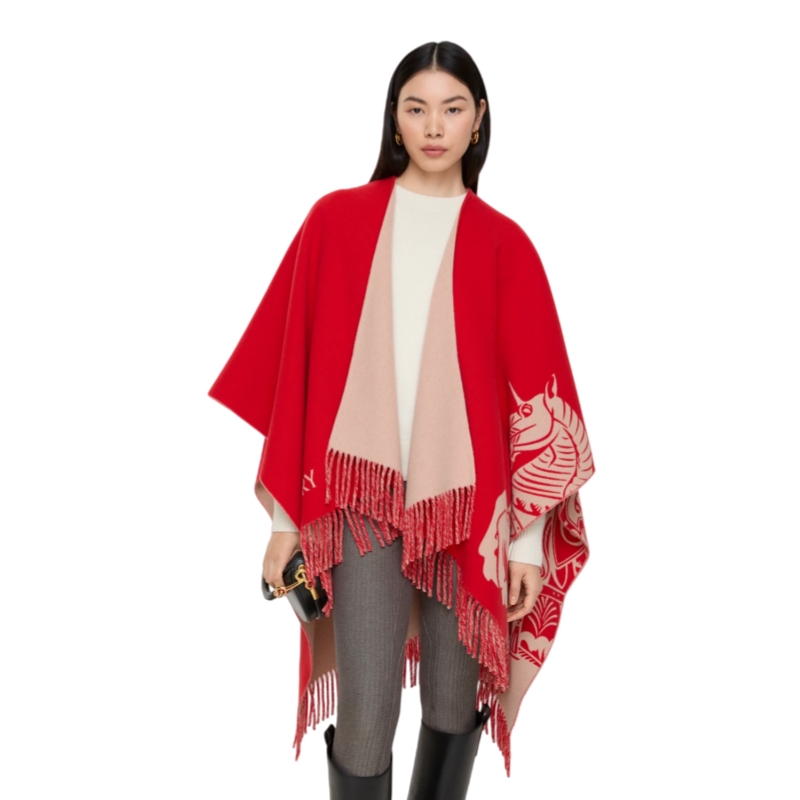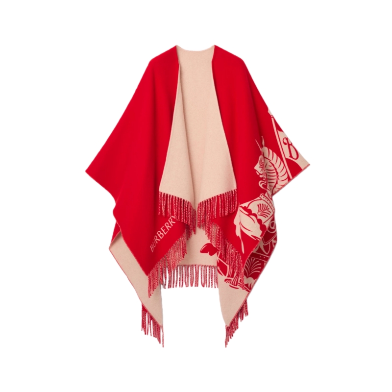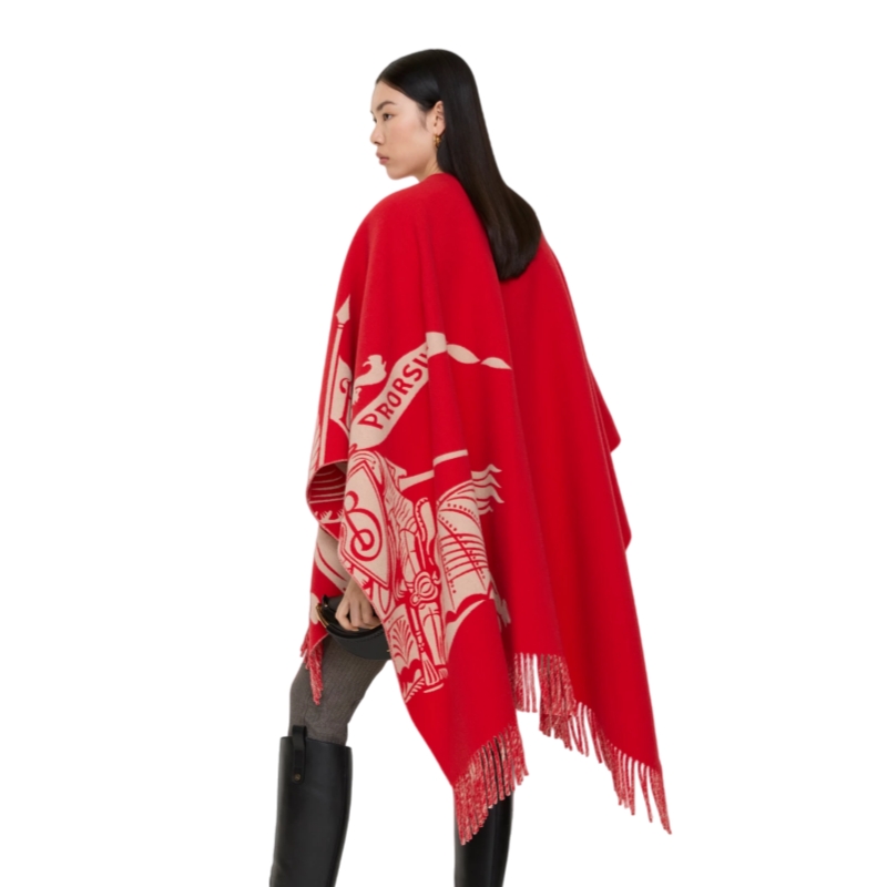 A two-tone cape made in Italy from double-faced wool cashmere. The style is jacquard-woven with our logo and Equestrian Knight Design in seasonal crayon red – created as part of our Year of the Horse capsule. The fabric receives two additional washes for an ultra-soft finish and raised nap.