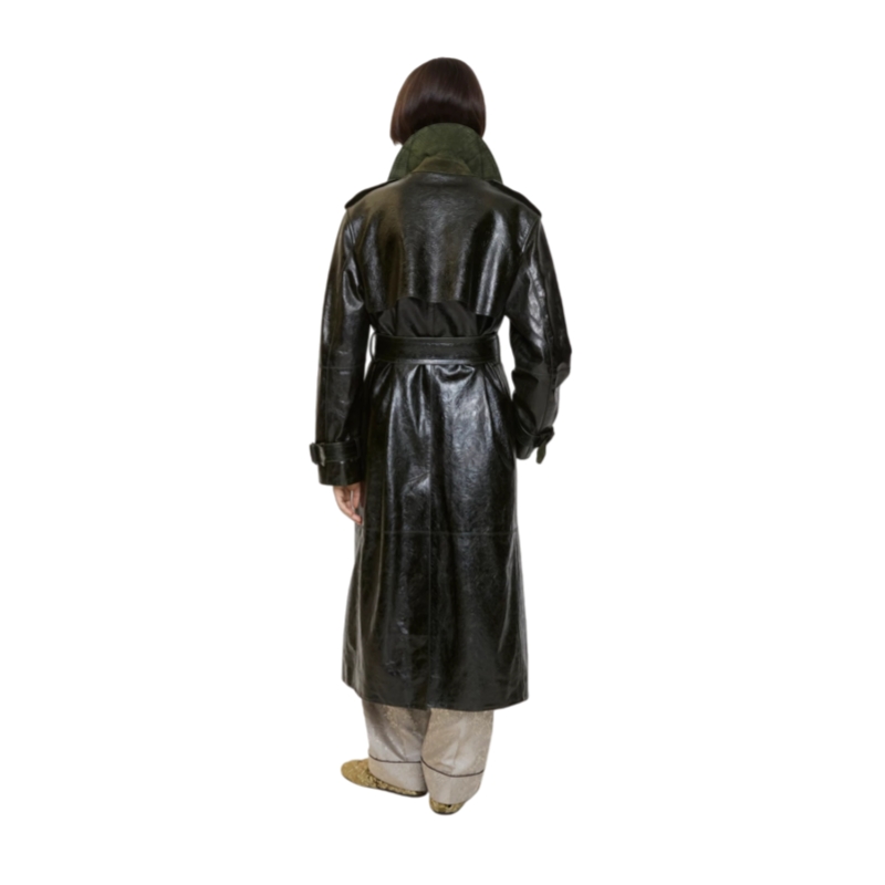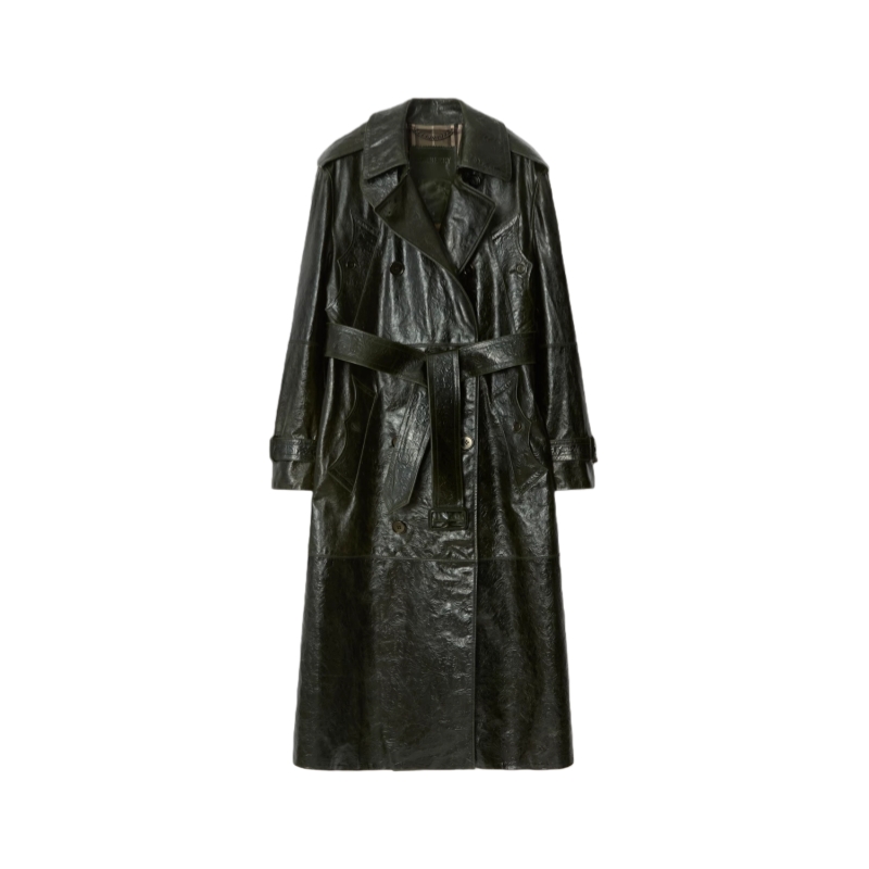 Reworking signature Burberry rainwear, a trench coat made in Italy from embossed calf leather. The Baroque-style pattern is inspired by the exquisite, faded interiors of British stately homes. Debuted on the Burberry Winter 2025 runway, the style is cut to a relaxed fit with wide raglan sleeves and lined with a tonal Burberry Check. An archival coat inspires the curlicue shape of the pockets and the undercollar is subtly stitched with our signature check.