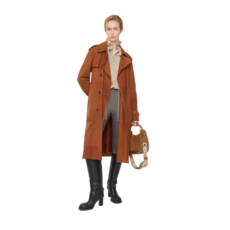 A fresh expression of our Castleford trench coat, crafted in Italy from soft nubuck and framed with nappa leather trims. The unlined style is cut to a generous, regular fit with soft shoulders for effortless layering over knitwear and tailoring. Finished with check stitching under the collar and metal hardware in an antique finish.