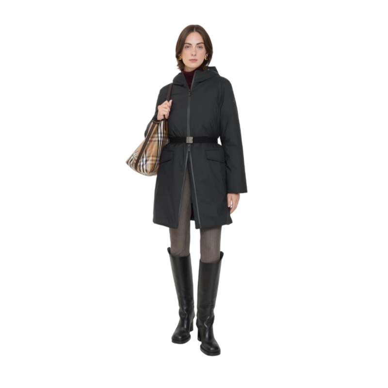 A hooded coat in lightweight ripstop nylon, padded with goose down and feathers. The design is lined with fleece at the side pockets and appliquéd with a leather Knight stamp, an archival motif from the 1980s. Cut to a regular fit with an elasticated Burberry Check belt to cinch the waist.