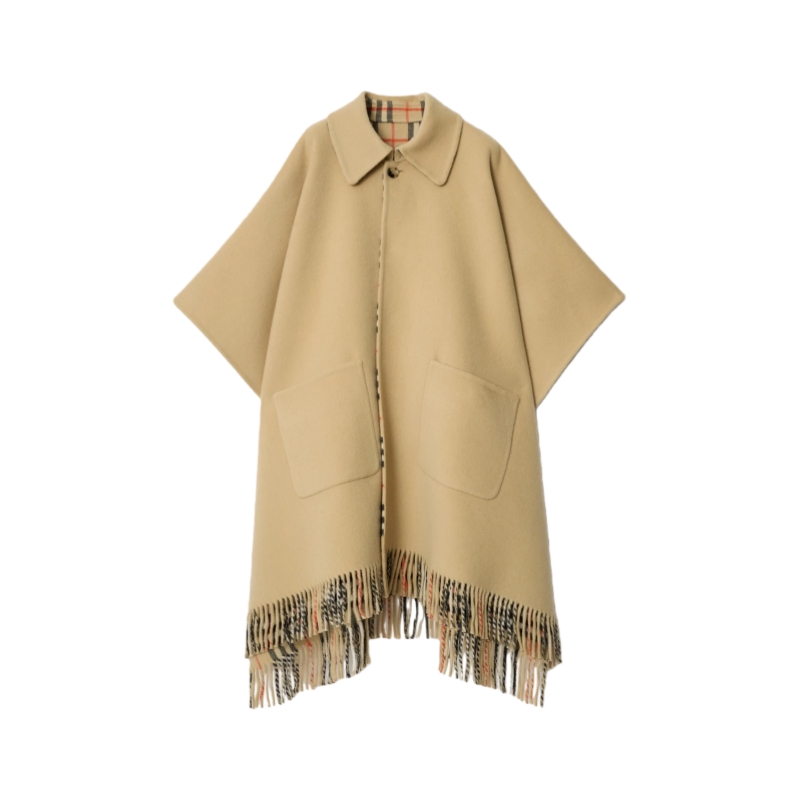 A cape woven in Italy from double-faced wool, reversing from a solid colour to the Burberry Check in signature sand beige. Drawing on our outerwear heritage, the style is tailored with a neat point collar and button closure.