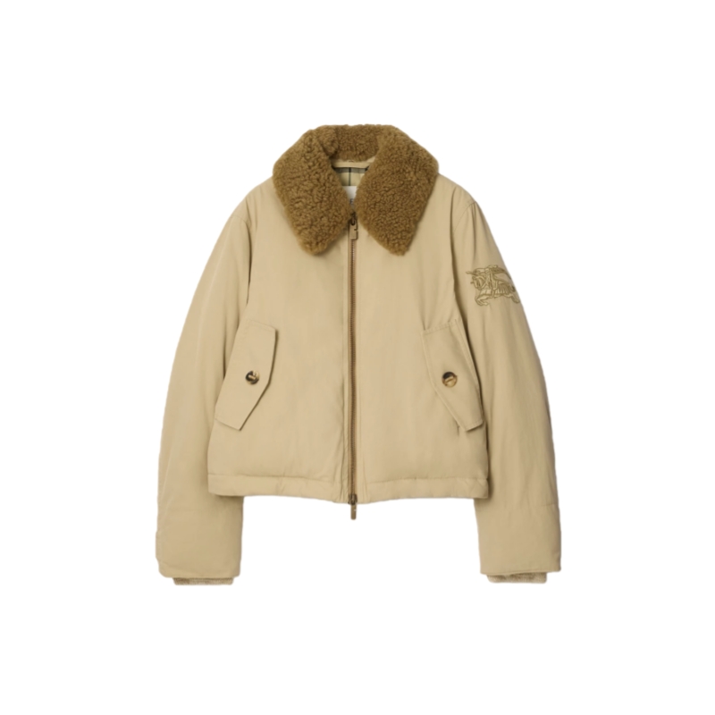 A jacket in cotton nylon gabardine, washed for a soft finish and padded with goose down and feathers. Part of our Gabardine Capsule, the design pays homage to the house’s iconic signature – a revolutionary fabric invented by Thomas Burberry, worn by explorers and everyday adventurers alike. Inside the jacket is lined with the Burberry Check and features a specially designed label inspired by an archival campaign. Cut to a regular fit, the style is finished with a detachable shearling collar and our Equestrian Knight Design embroidered in metallic threads.
