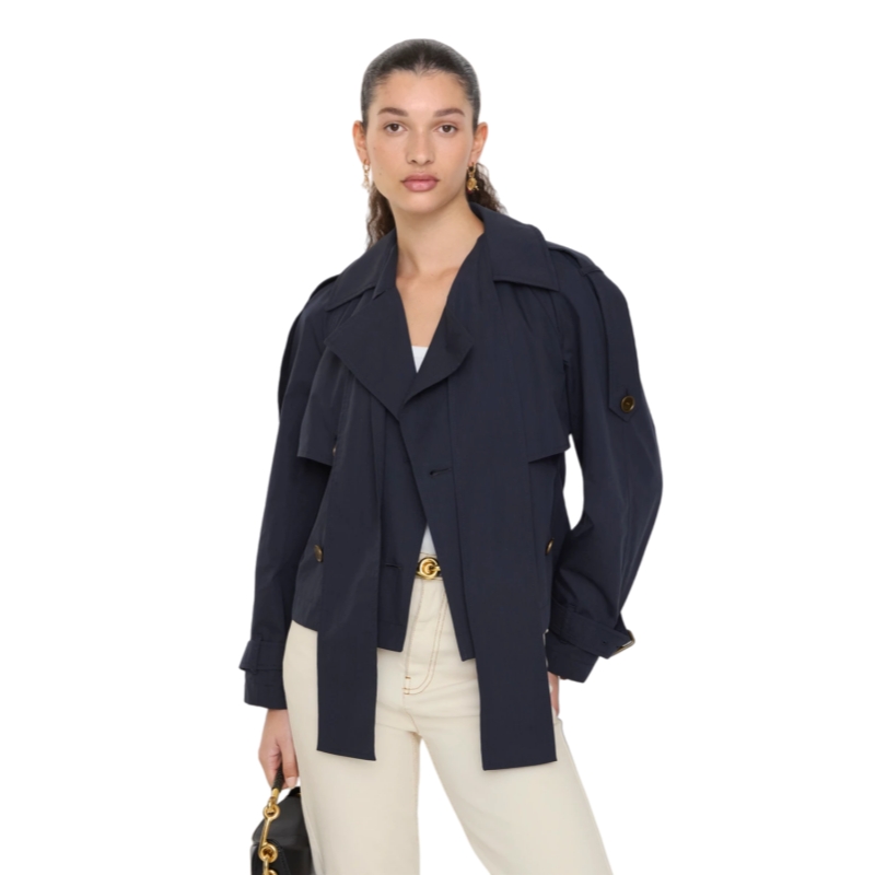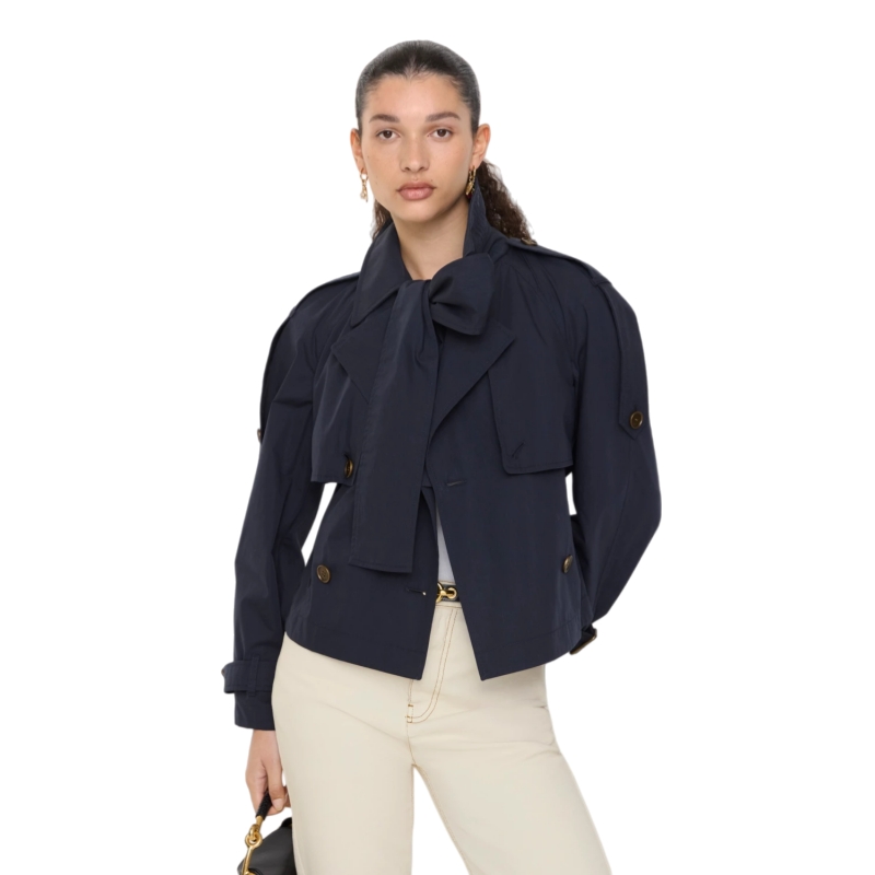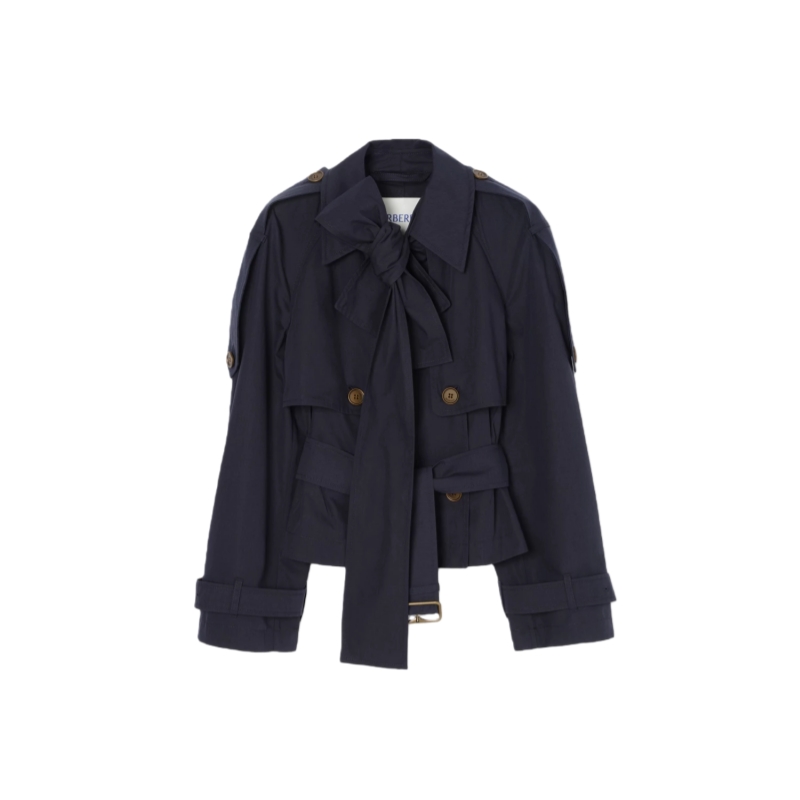 An expressive silhouette, the versatile Trerose trench coat is crafted from a lightweight cotton blend canvas, treated for a soft hand feel. The fit-and-flare shape features a gathered storm shield at the back for added volume, while scarf ties at the neck can be knotted into a bow. Wear the trench open or cinch the waist using the detachable B buckle belt. The design is detailed with check stitching under the collar and antique-finish metal hardware.