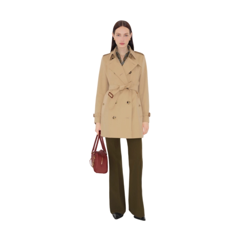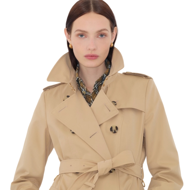A refined take on Burberry’s rainwear heritage, the Chelsea trench coat is cut close to the body for a clean, modern silhouette. The fitted style is made in England from shower-resistant cotton gabardine and detailed with leather-wrapped buckles. Tailored to a slim fit, the double-breasted design has a structured shoulder line, narrow sleeves, and a defined waistline. Wear it closed using the belt or open over dresses and separates to showcase the iconic check lining.