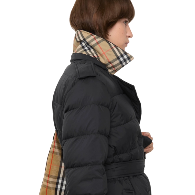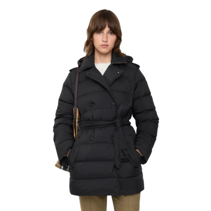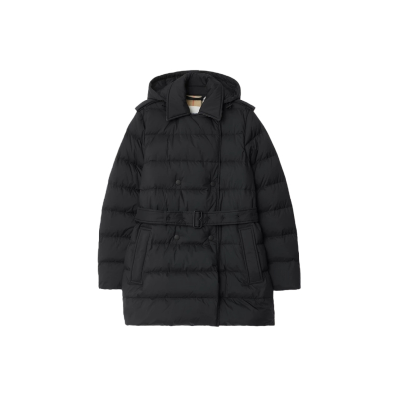 Inspired by the Burberry trench, a puffer coat in nylon filled with goose down and feathers. The double-breasted design is cut to a regular fit with signature epaulettes and a detachable B buckle belt. Adapt the silhouette by removing the hood and pop the collar to reveal a flash of Burberry Check.
