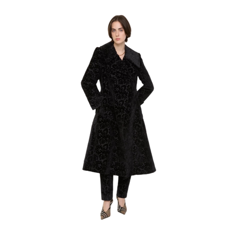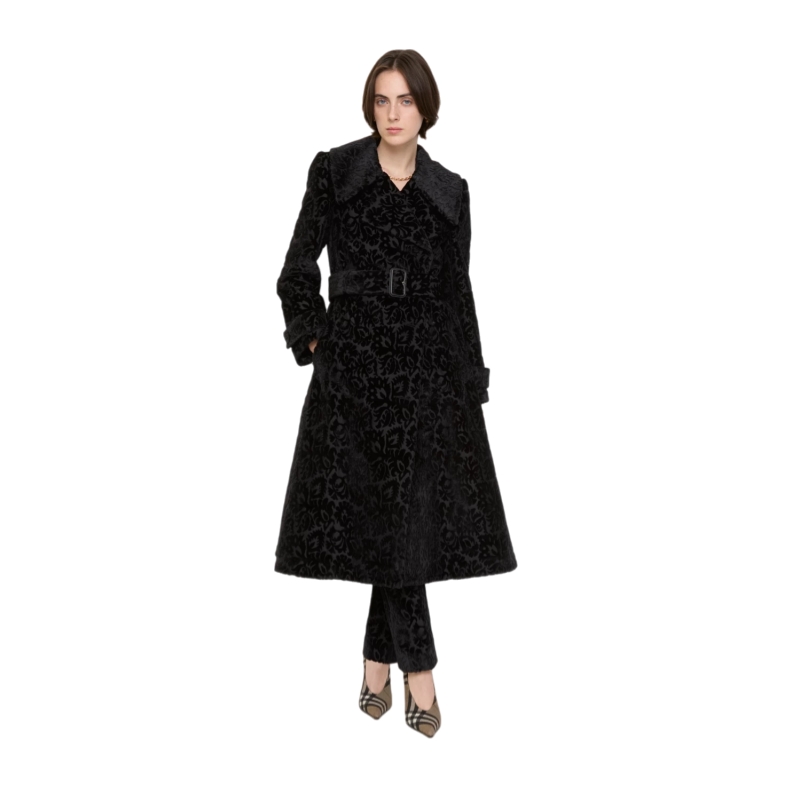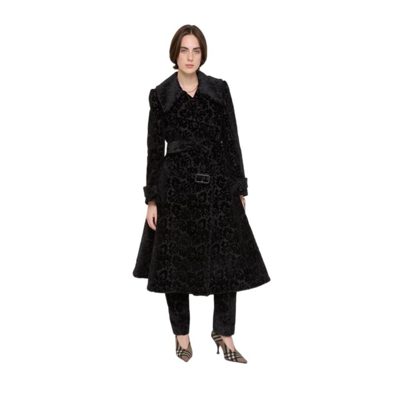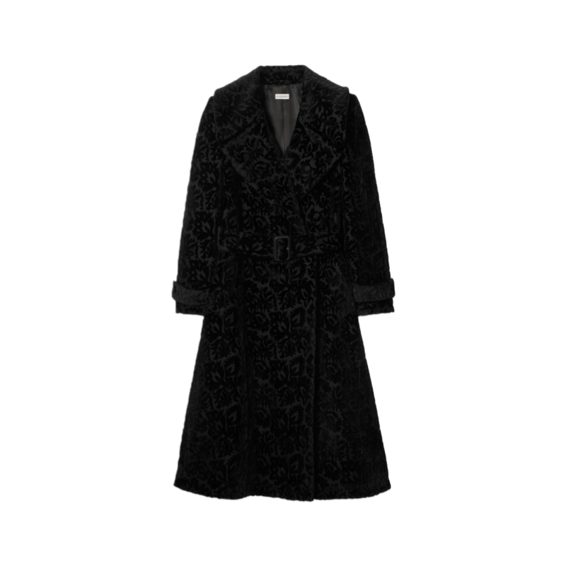 A coat made in Italy from silk blend velvet, jacquard-woven with intertwining flora and fauna. The textural fabric is inspired by the richly furnished interiors of great country houses. Debuted on the Burberry Winter 2025 runway, the style is tailored to an A-line silhouette with a slim, belted waist and fuller skirt.