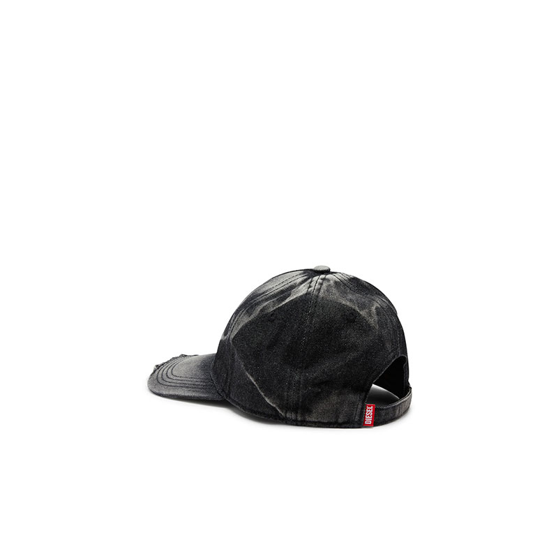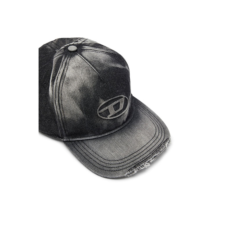 This men's five-panel baseball cap is made from black denim with a heavily destroyed treatment and contrast-colour stitching. A large embossed Oval D logo decorates the front.