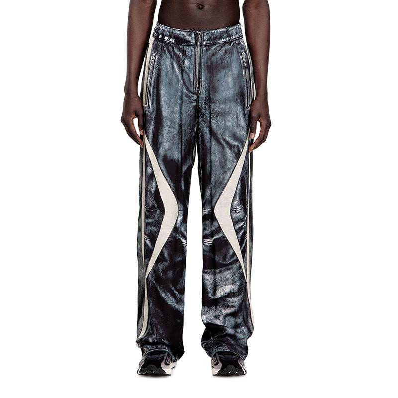 A moto pant illusion, these men’s satin trousers feature a hyper-realistic trompe l'oeil print that mimics the look of colour-block biker leathers, right down to the zips. The fabric is woven from lower-impact cellulosic viscose fibres and moves with fluid ease. A hidden drawstring secures the elasticated waist.