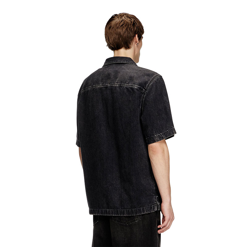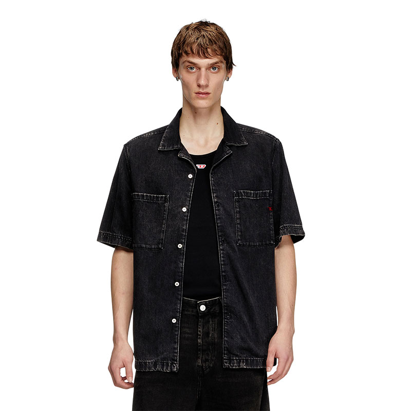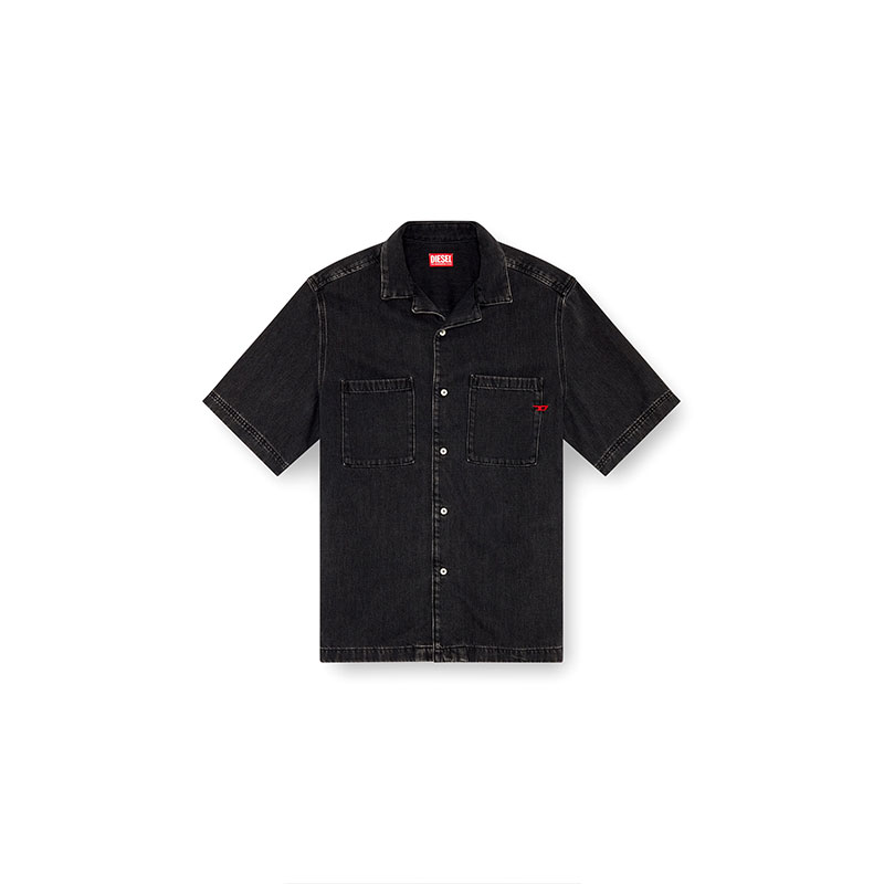 Men's bowling shirt in black TENCEL Lyocell denim with subtle treatments, featuring a camp collar and short sleeves. Detailed with a red D logo embroidery on the left chest pocket.