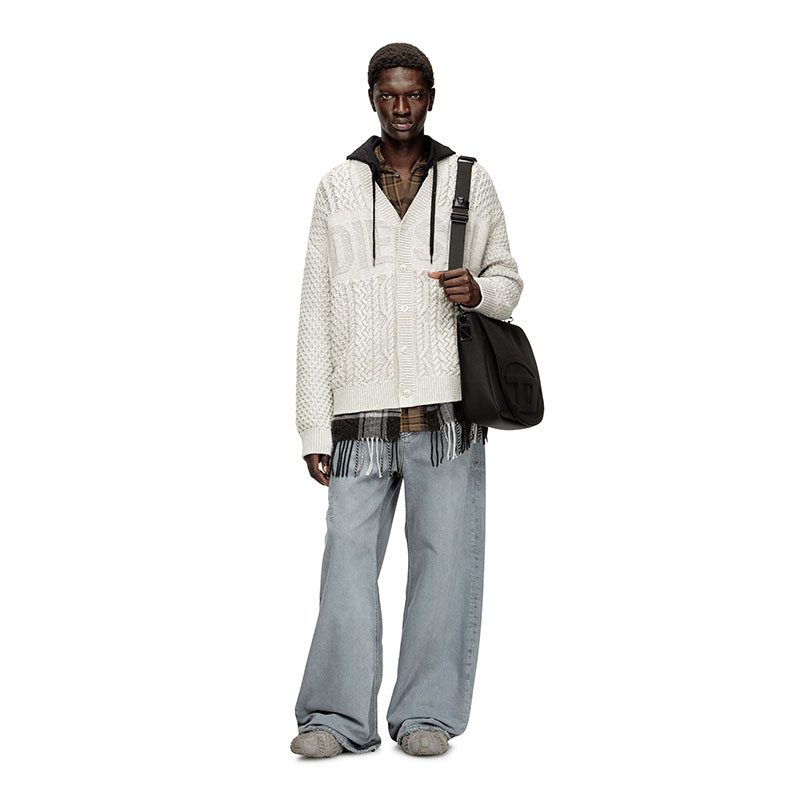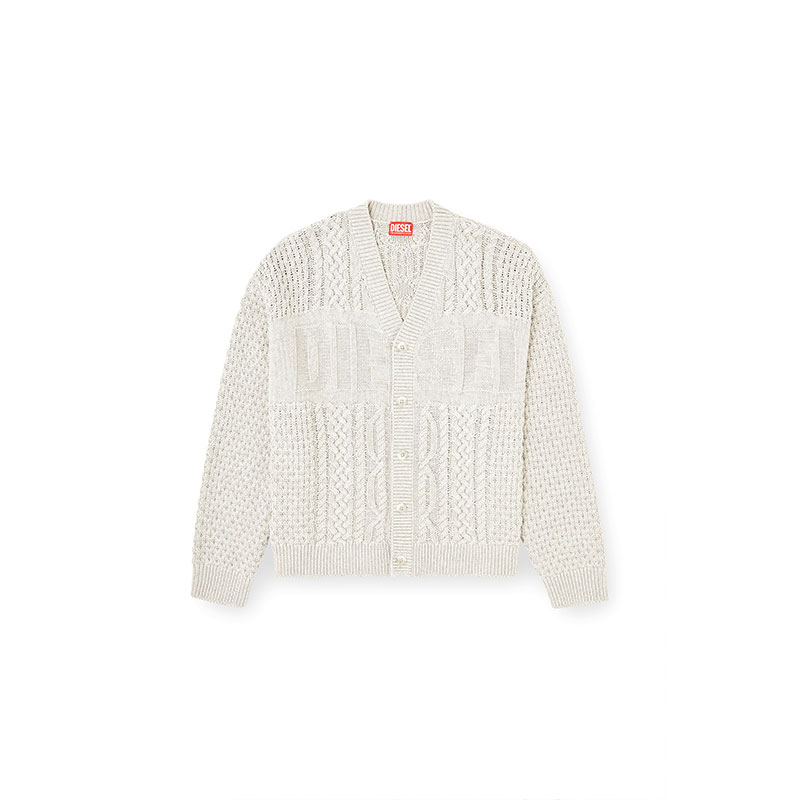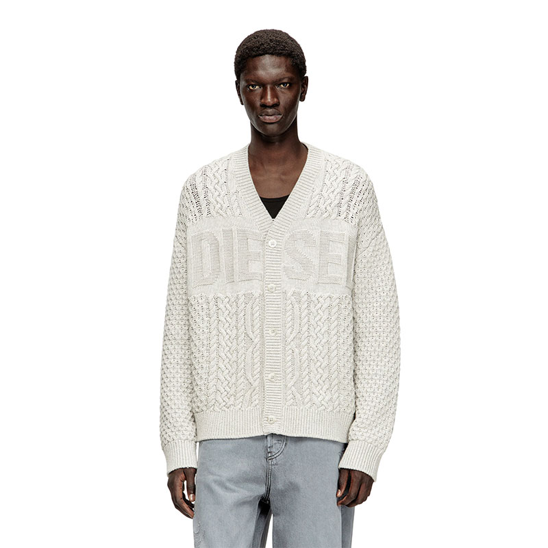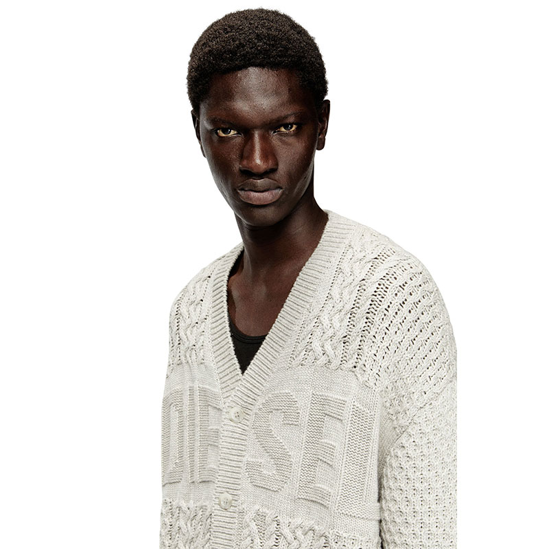 This men’s V-neck cardigan is knitted using a variety of stitches to create its multi-textural finish, with plenty of cables and Diesel lettering – the logo design is equal parts statement and stealth. Spun from wool and cotton, it has tonal buttons ribbed trims.