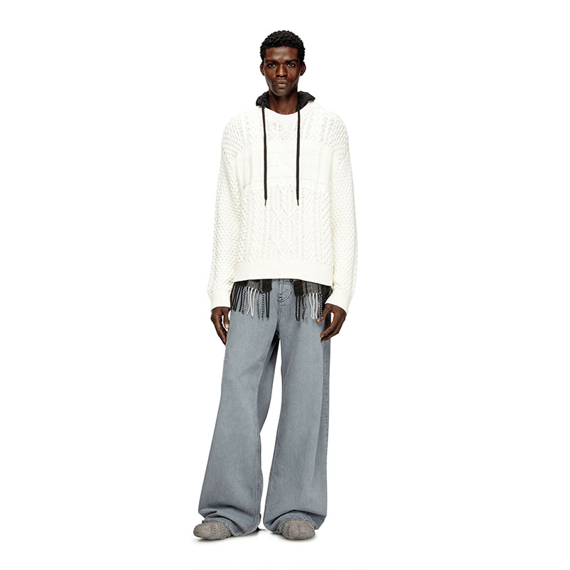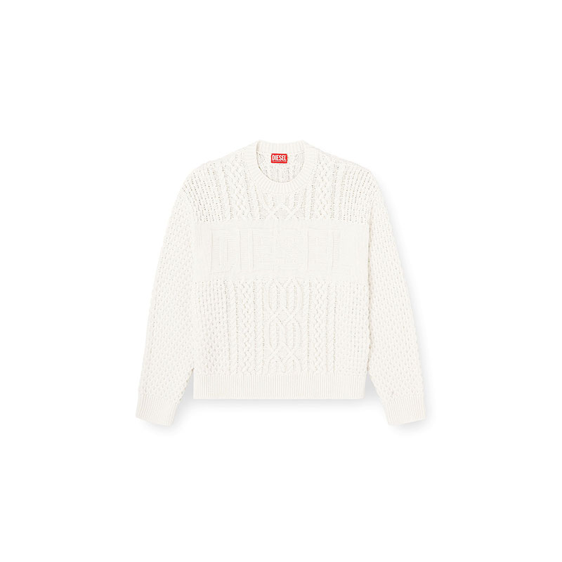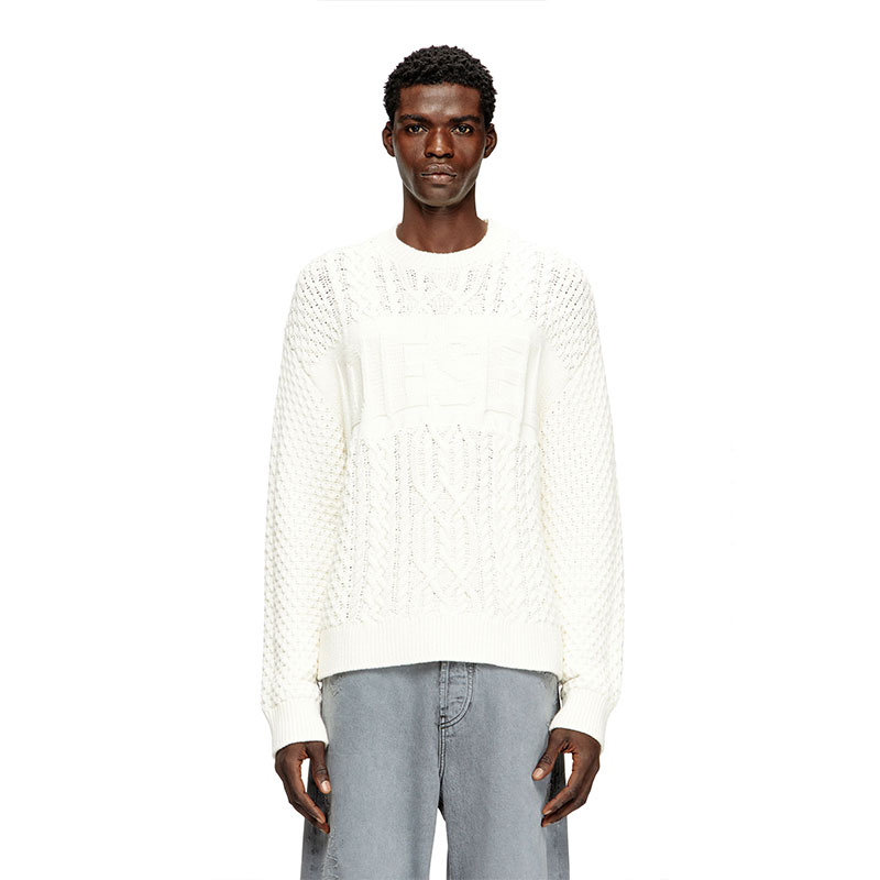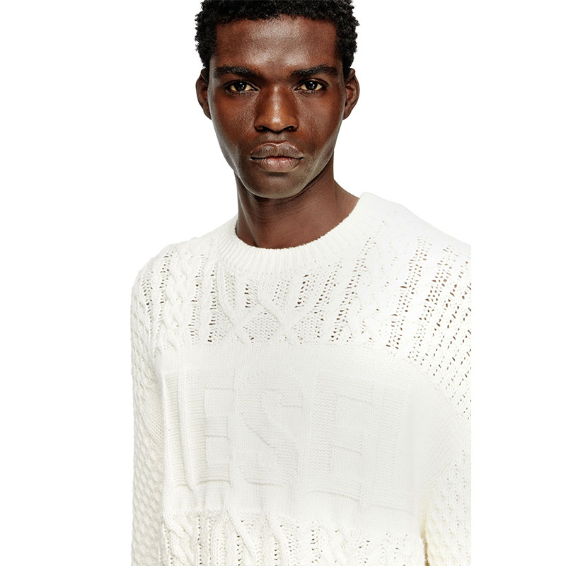 This men's sweater is knitted using a variety of stitches to create its multi-textural finish, with plenty of cables and Diesel lettering – the logo design is equal parts statement and stealth. Spun from wool and cotton, it has a classic crewneck profile and ribbed trims.