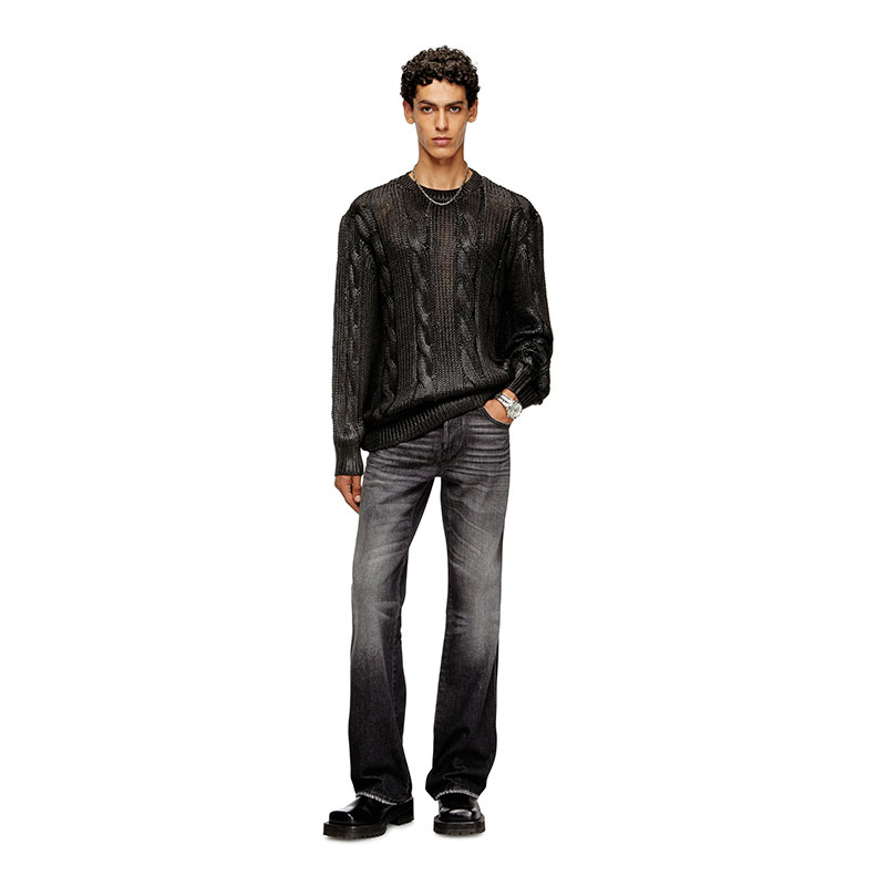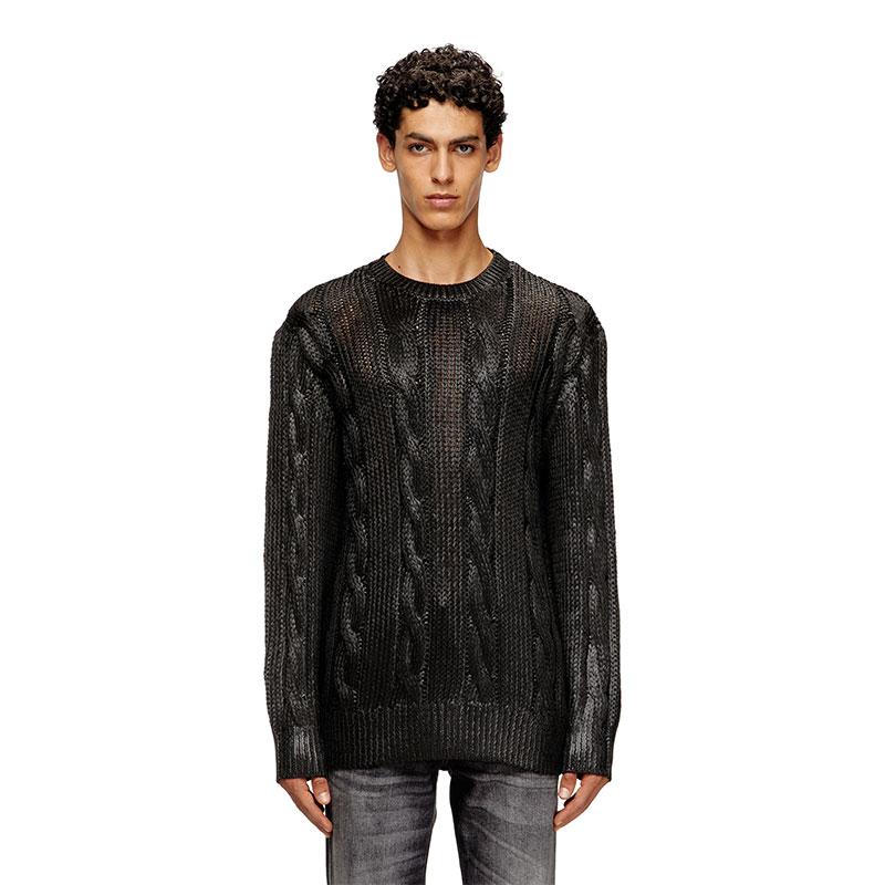 A subversion of a classic knit, this men’s sweater feels celebratory in an understated way. It’s knitted with cables on the front and sleeves and heat-pressed to give it the sleek, shiny finish.