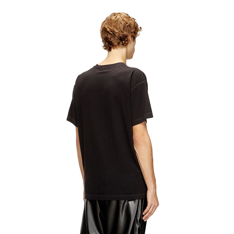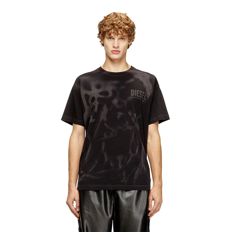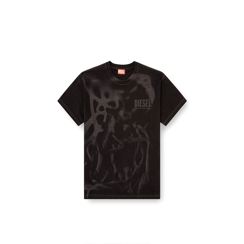 Crew neck T-shirt with short sleeves and a regular fit. Made of organic-cotton jersey, it features an all-over laser print on the front that gives the garment a distinctive look. The Diesel logo stands out on the chest, adding a touch of character and recognizability to the design. The red Diesel label is positioned on the left side.