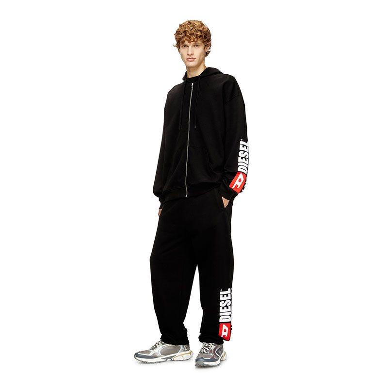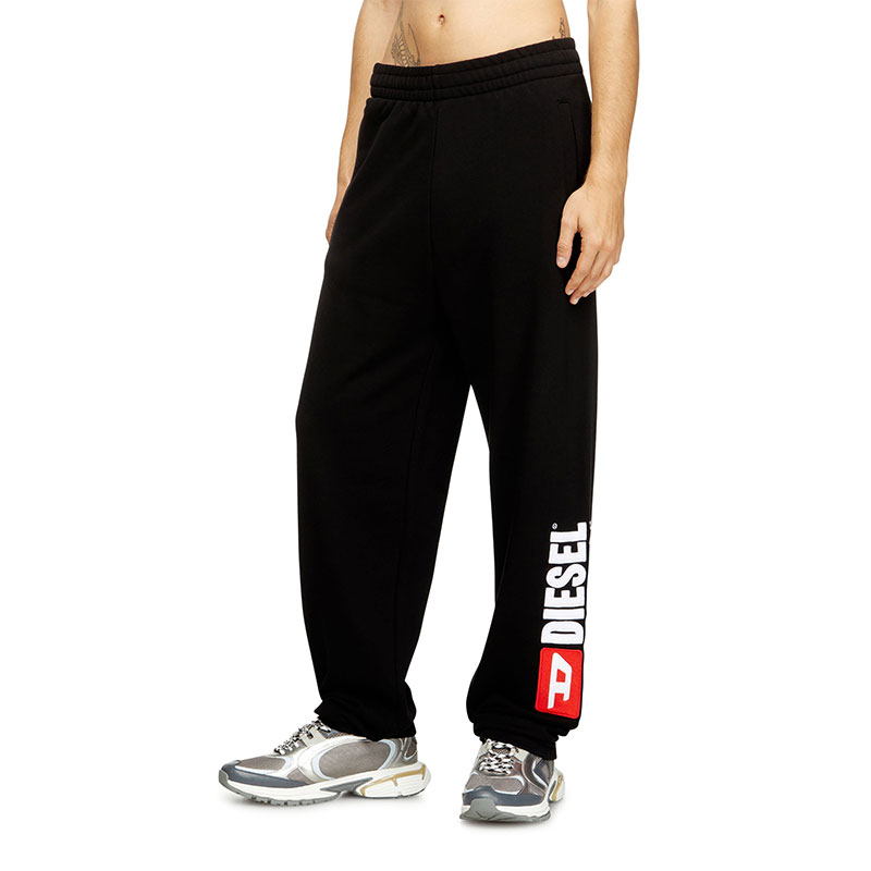 Regular-fit sweatpants with an elastic waistband and elasticated cuffs at the ankles. Made of unbrushed organic-cotton fleece, they feature hidden side pockets and a single pocket at the back. Inside the waistband, a flat cotton drawstring is finished with Oval D printed plastic tips. On the left side, the iconic embroidered Diesel Denim Division patch adds a distinctive touch.
