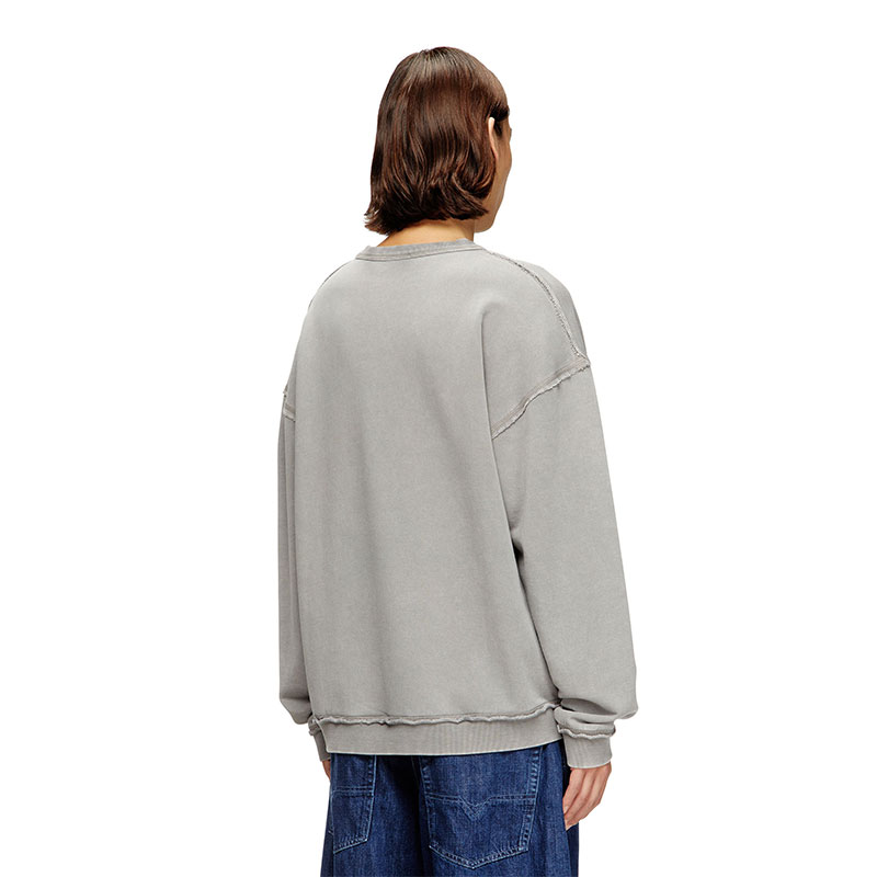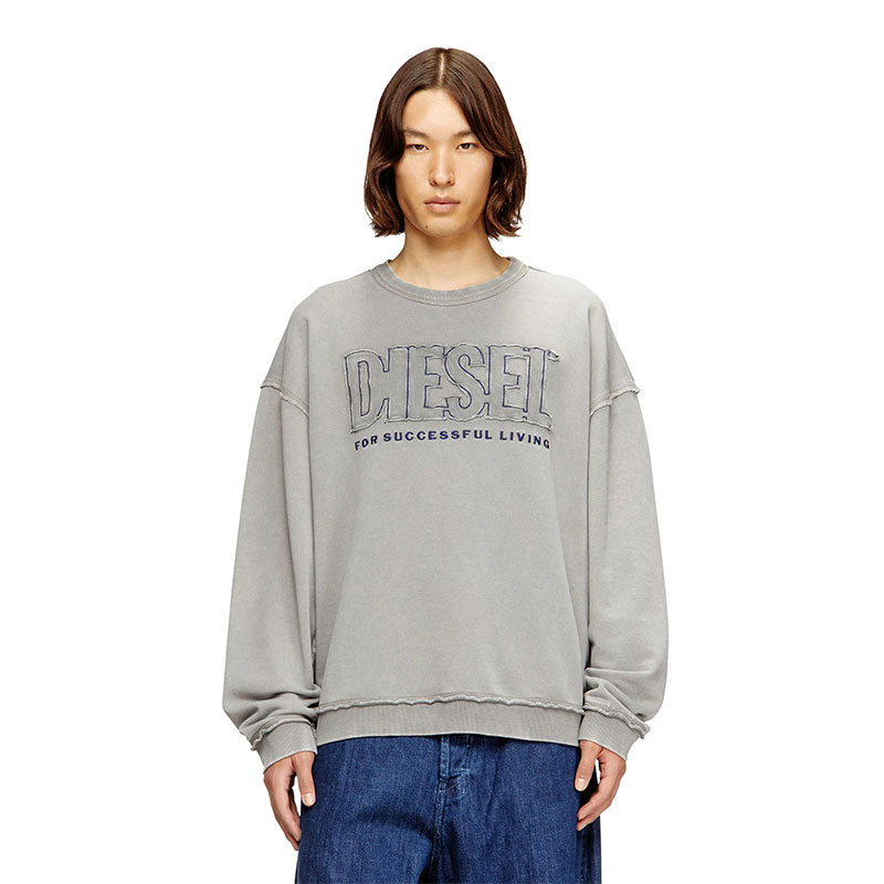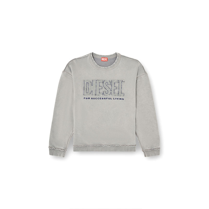 Crew neck sweatshirt with a relaxed fit, made of unbrushed fleece with a percentage of organic cotton. Featuring a ribbed collar, cuffs, and lower hem, it showcases a Diesel For Successful Living application and embroidery on the front, enriched with visible external seams and raw cut edges. The sweatshirt has undergone an acid washed treatment and garment dyeing, giving it a distinctive worn effect.