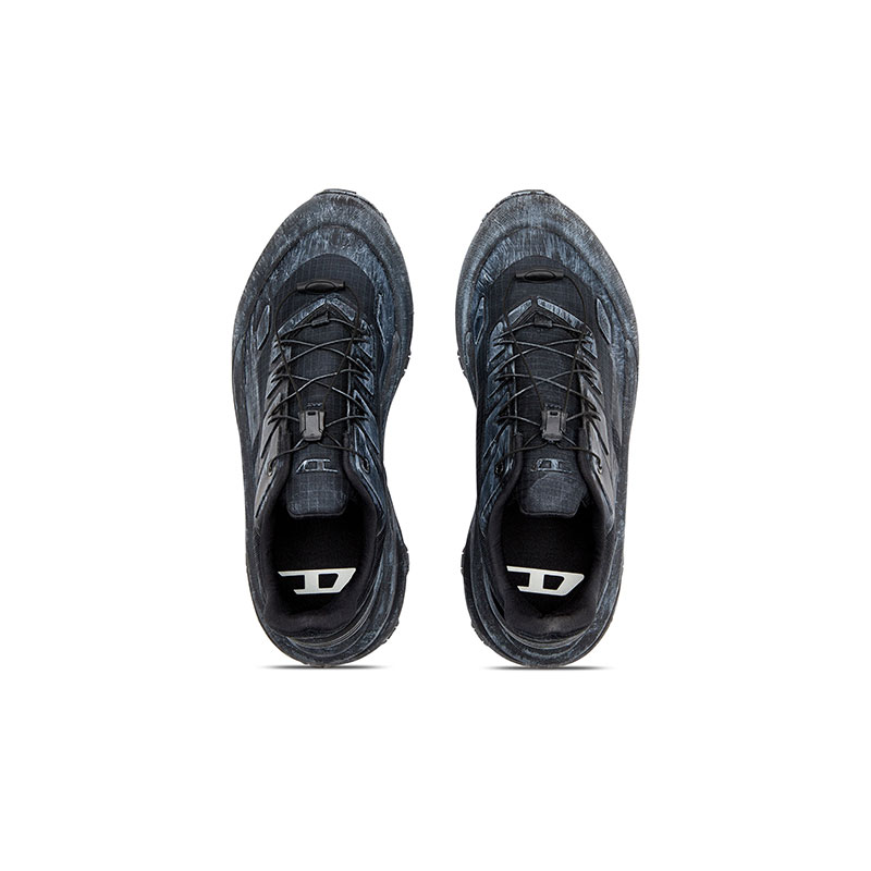 This urban men's sneaker is cut from breathable fabric with trekking details. The bold design features a chunky rubber sole with custom tread and heat embossed tonal logos on the side and at the tip. A unique coating is applied to the fabric to create a lived in look, in contrast with the sharp lines. The slim round elastic laces are fastened via a drawstring tab.