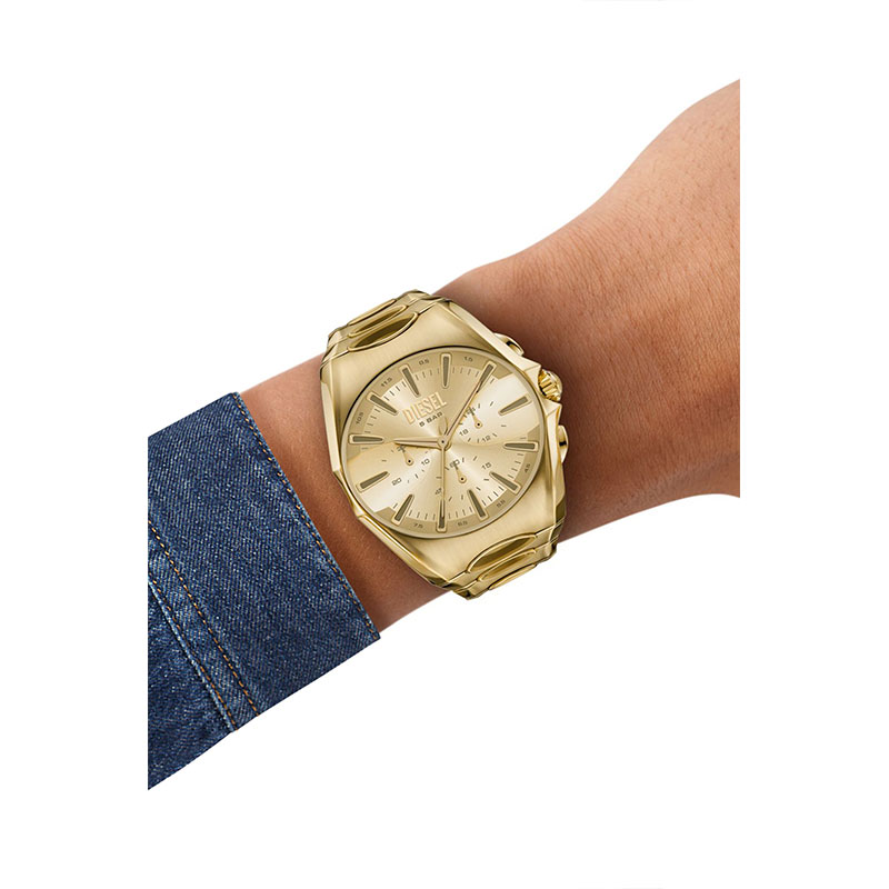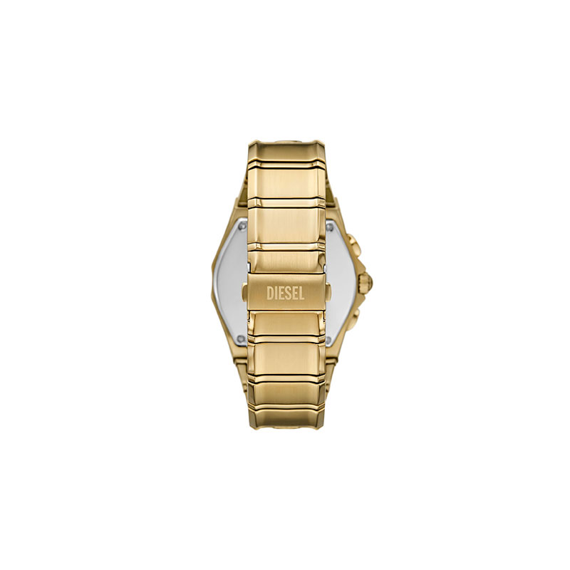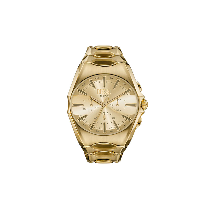 Diesel's 44mm D-Curve watch features a gold-tone sunray dial, chronograph movement, and a gold-tone stainless steel bracelet that is made more unique by circular cut-outs.