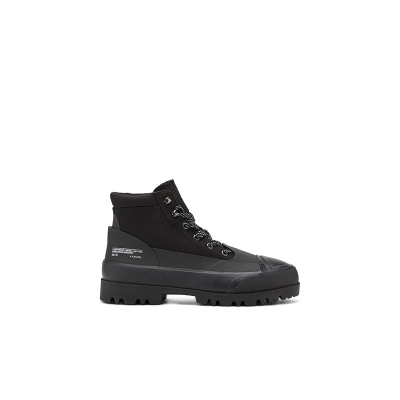 Informed by hiking and military styles, these unisex shoes have heavy-duty ballistic-nylon uppers trimmed with layers of rubber that completely cover the vamp. The combination of rubber foxing and rugged lug sole underpins the hybrid sneaker-boot silhouette.