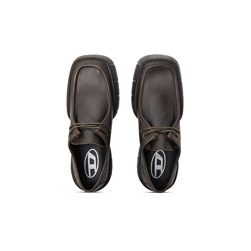 Moccasin DNA meets a monster stole. These men’s lace-up shoes are crafted from brushed brown leather full of lived-in character. Featuring classic moc stitching and squared-off toes, they rest on exaggerated rubber soles with a cool split construction that exposes the upper. Despite the chunkiness, the shoe feels lightweight and extremely comfortable.