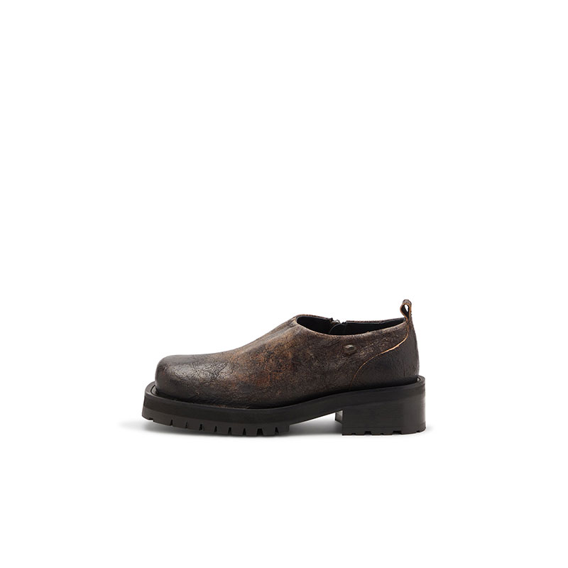 Rugged, distressed and beaten-up, these men's hybrid clogs look they've been through the wringer. Crafted from high-quality brown waxed suede with a crackle texture, they have darkened squared-off toes and chunky rubber lug soles. The zipped upper is cut below the ankle and subtly detailed with rusty-effect metal D hardware in the shape of a bubble.