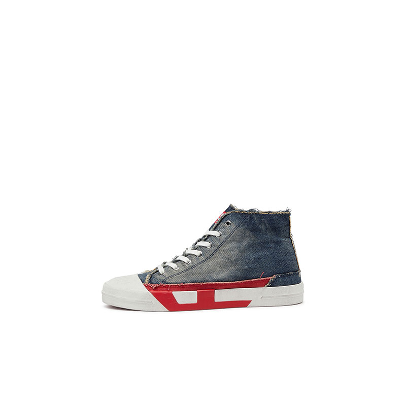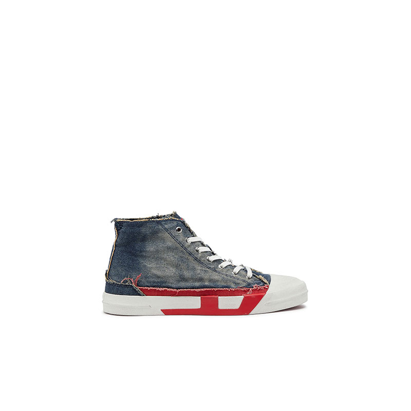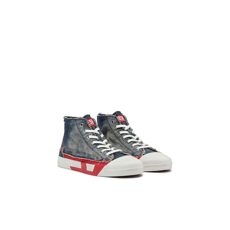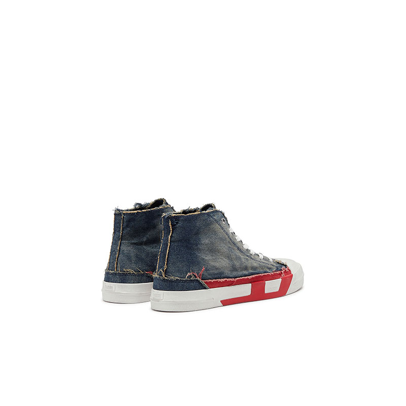 Diesel’s signature red D, blown up and doubled down. Flanking the sides of this men’s high-top sneaker, the emblem spans the upper and sole – half stitched in fabric, half cast in rubber for a cool dual identity. The faded denim construction and raw frays channel the brand's DNA. Set on a vulcanised rubber sole with a gripped red bottom.