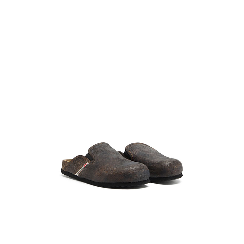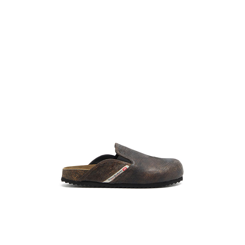 Men's mules with a classic clog silhouette. Updated in premium crackle-effect suede with a burnished brown hue, these shoes deliver a distressed, vintage look. The slip-on upper is detailed with elasticated inserts for a more flexible fit and set on a comfortable cork-mix footbed and grippy serrated sole. The logo flag is an iconic Diesel jean hallmark.