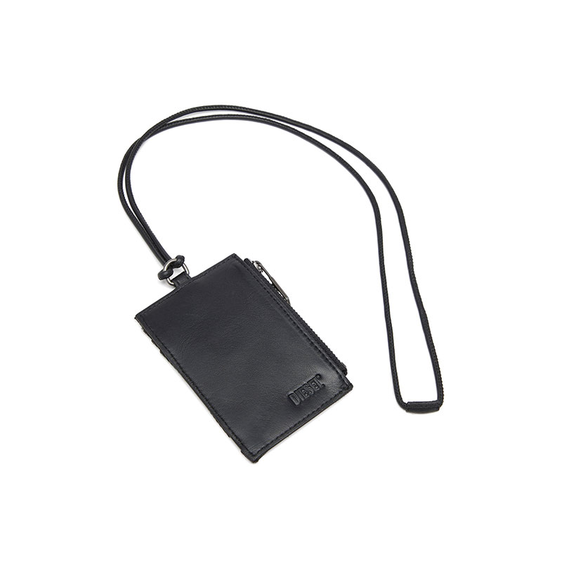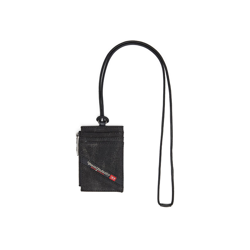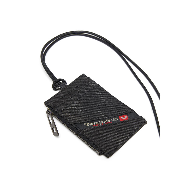 Functional design badge holder made of denim leather. It features a zippered pocket and card slots, while the embossed logo is on the back. The strap is adjustable for convenience.