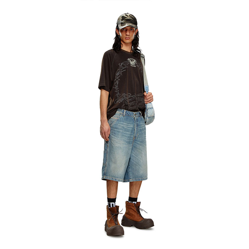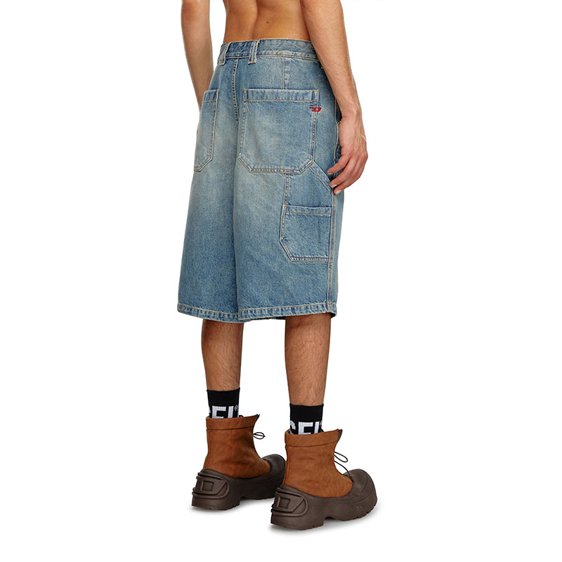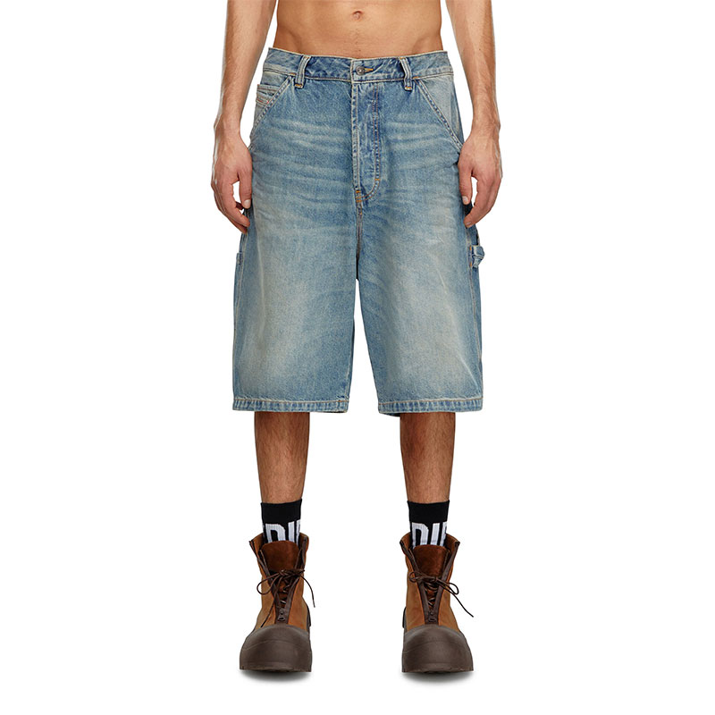 These men’s denim shorts feature a relaxed-leg, knee-length fit and workwear-inspired details, such as the hammer loop and small patch pockets on the side of the leg.