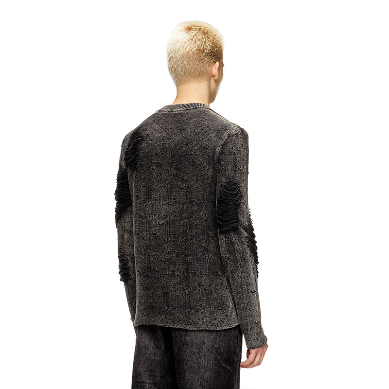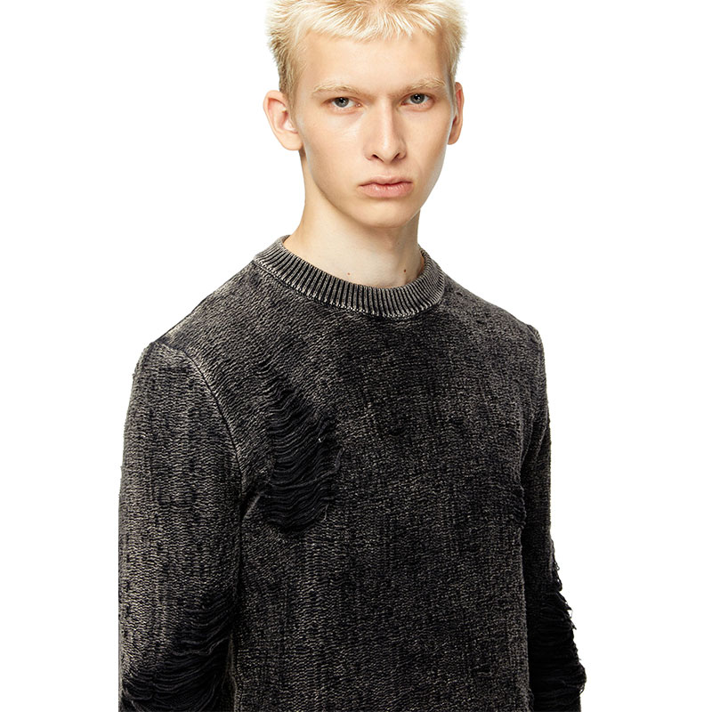 This men’s sweater is one of many expressions of Diesel’s sartorial language seen during the FW25 Runway Show. Knitted from organic cotton yarn in a black indigo hue, it features an elaborate overdyed construction with meticulously engineered rips, ladders and hanging threads – elevation through disruption.
