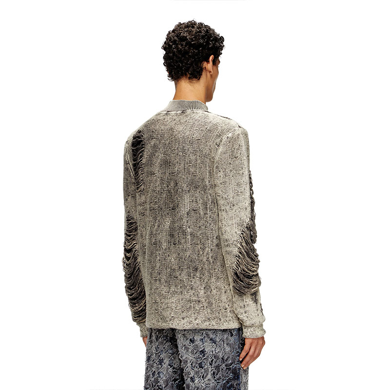 This men’s sweater is an exclusive FW25 Runway Show piece with a rebellious soul. Rips, hanging threads and laddered distressing reveal deeper indigo tones of the knit and signal the disruption of classic codes. It’s crafted from 100% organic cotton and features a mock neckline.