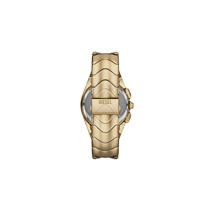 Diesel's 45mm Mercurial watch features a gold sunray dial, chronograph movement, and a polished gold-tone stainless steel bracelet.