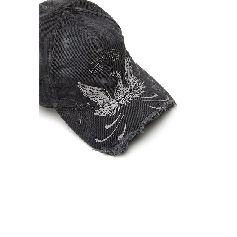 Men's baseball cap in robust and durable cotton gabardine, detailed with a digital-print Phoenix logo and contrast stitching. This hat been heavily treated and frayed for a signature destroyed look.